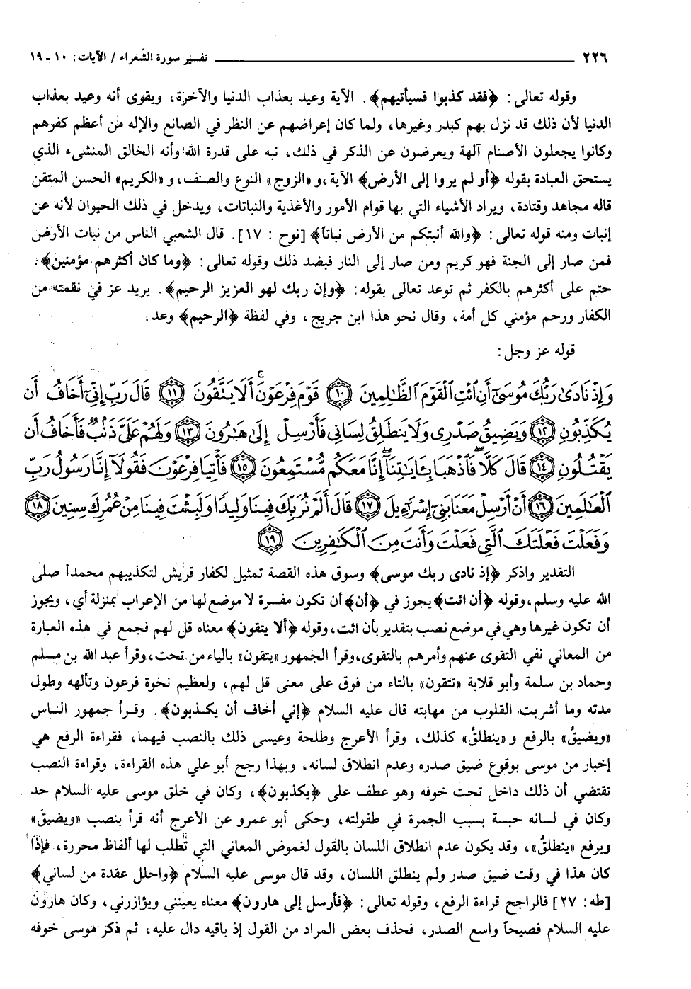 وَإِذْ نادى رَبُّكَ مُوسى أَنِ ائْتِ الْقَوْمَ الظَّالِمِينَ (١٠) قَوْمَ فِرْعَوْنَ أَلا يَتَّقُونَ (١١) قالَ رَبِّ إِنِّي أَخافُ أَنْ يُكَذِّبُونِ (١٢) وَيَضِيقُ صَدْرِي وَلا يَنْطَلِقُ لِسانِي فَأَرْسِلْ إِلى هارُونَ (١٣) وَلَهُمْ عَلَيَّ ذَنْبٌ فَأَخافُ أَنْ يَقْتُلُونِ (١٤)