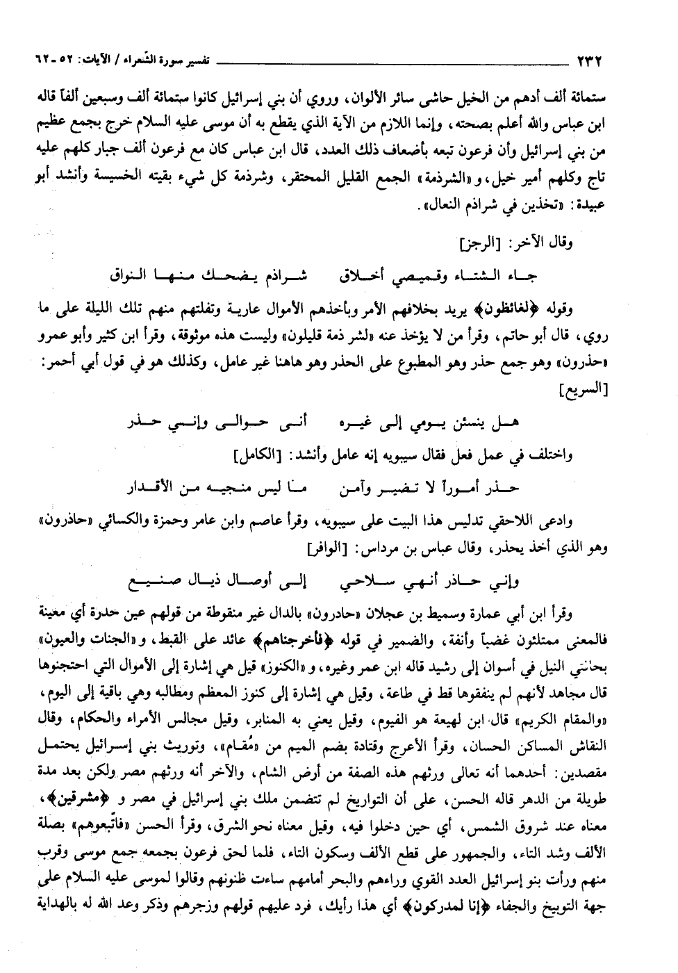 وادعى اللاحقي تدليس هذا البيت على سيبويه، وقرأ عاصم وابن عامر وحمزة والكسائي «حاذرون» وهو الذي أخذ يحذر، وقال عباس بن مرداس: [الوافر]
