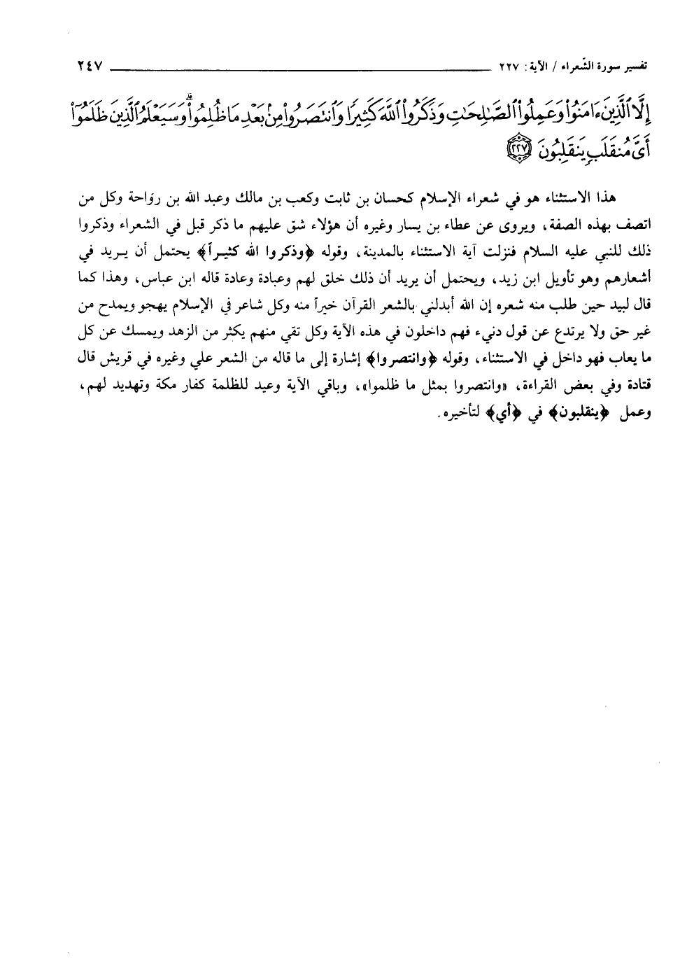 هذا الاستثناء هو في شعراء الإسلام كحسان بن ثابت وكعب بن مالك وعبد الله بن رواحة وكل من اتصف بهذه الصفة، ويروى عن عطاء بن يسار وغيره أن هؤلاء شق عليهم ما ذكر قبل في الشعراء وذكروا ذلك للنبي عليه السلام فنزلت آية الاستثناء بالمدينة، وقوله وَذَكَرُوا اللَّهَ كَثِيراً يحتمل أن يريد في أشعارهم وهو تأويل ابن زيد، ويحتمل أن يريد أن ذلك خلق لهم وعبادة وعادة قاله ابن عباس، وهذا كما قال لبيد حين طلب منه شعره إن الله أبدلني بالشعر القرآن خيرا منه وكل شاعر في الإسلام يهجو ويمدح من غير حق ولا يرتدع عن قول دنيء فهم داخلون في هذه الآية وكل تقي منهم يكثر من الزهد ويمسك عن كل ما يعاب فهو داخل في الاستثناء، وقوله وَانْتَصَرُوا إشارة إلى ما قاله من الشعر علي وغيره في قريش قال قتادة وفي بعض القراءة، «وانتصروا بمثل ما ظلموا» ، وباقي الآية وعيد للظلمة كفار مكة وتهديد لهم، وعمل يَنْقَلِبُونَ في أَيَّ لتأخيره.