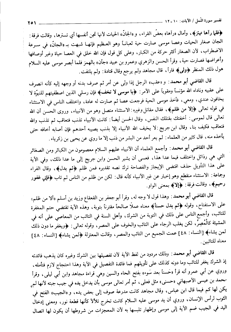 قال القاضي أبو محمد: و «عقب» الرجل إذا ولى عن أمر ثم صرف بدنه أو وجهه إليه كأنه انصرف على عقبيه وناداه الله مؤنسا ومقويا على الأمر: يا مُوسى لا تَخَفْ فإن رسلي الذين اصطفيتهم للنبوّة لا يخافون عندي، ومعي، فأخذ موسى الحية فرجعت عصا ثم صارت له عادة، واختلف الناس في الاستثناء في قوله تعالى إِلَّا مَنْ ظَلَمَ، فقال مقاتل وغيره: الاستثناء متصل وهو من الأنبياء، وروى الحسن أن الله تعالى قال لموسى: أخفتك بقتلك النفس، وقال الحسن أيضا: كانت الأنبياء تذنب فتعاقب ثم تذنب والله فتعاقب فكيف بنا، وقال ابن جريج: لا يخيف الله الأنبياء إلا بذنب يصيبه أحدهم فإن أصابه أخافه حتى يأخذه منه، قال كثير من العلماء: لم يعر أحد من البشر من ذنب إلا ما روي عن يحيى بن زكرياء.