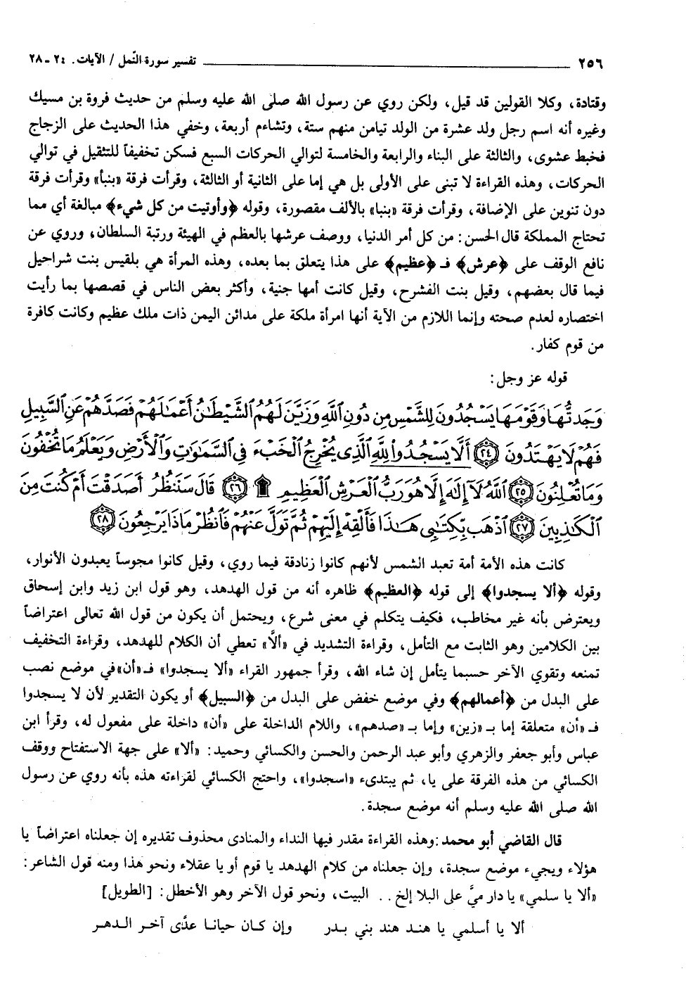 كانت هذه الأمة أمة تعبد الشمس لأنهم كانوا زنادقة فيما روي، وقيل كانوا مجوسا يعبدون الأنوار، وقوله أَلَّا يَسْجُدُوا إلى قوله الْعَظِيمِ ظاهره أنه من قول الهدهد، وهو قول ابن زيد وابن إسحاق ويعترض بأنه غير مخاطب، فكيف يتكلم في معنى شرع، ويحتمل أن يكون من قول الله تعالى اعتراضا بين الكلامين وهو الثابت مع التأمل، وقراءة التشديد في «ألّا» تعطي أن الكلام للهدهد، وقراءة التخفيف تمنعه وتقوي الآخر حسبما يتأمل إن شاء الله، وقرأ جمهور القراء «ألا يسجدوا» ف «أن» في موضع نصب على البدل من أَعْمالَهُمْ وفي موضع خفض على البدل من السَّبِيلِ أو يكون التقدير لأن لا يسجدوا ف «أن» متعلقة إما ب «زين» وإما ب «صدهم» ، واللام الداخلة على «أن» داخلة على مفعول له، وقرأ ابن عباس وأبو جعفر والزهري وأبو عبد الرحمن والحسن والكسائي وحميد: «ألا» على جهة الاستفتاح ووقف الكسائي من هذه الفرقة على يا، ثم يبتدىء «اسجدوا» ، واحتج الكسائي لقراءته هذه بأنه روي عن رسول الله صلى الله عليه وسلم أنه موضع سجدة.