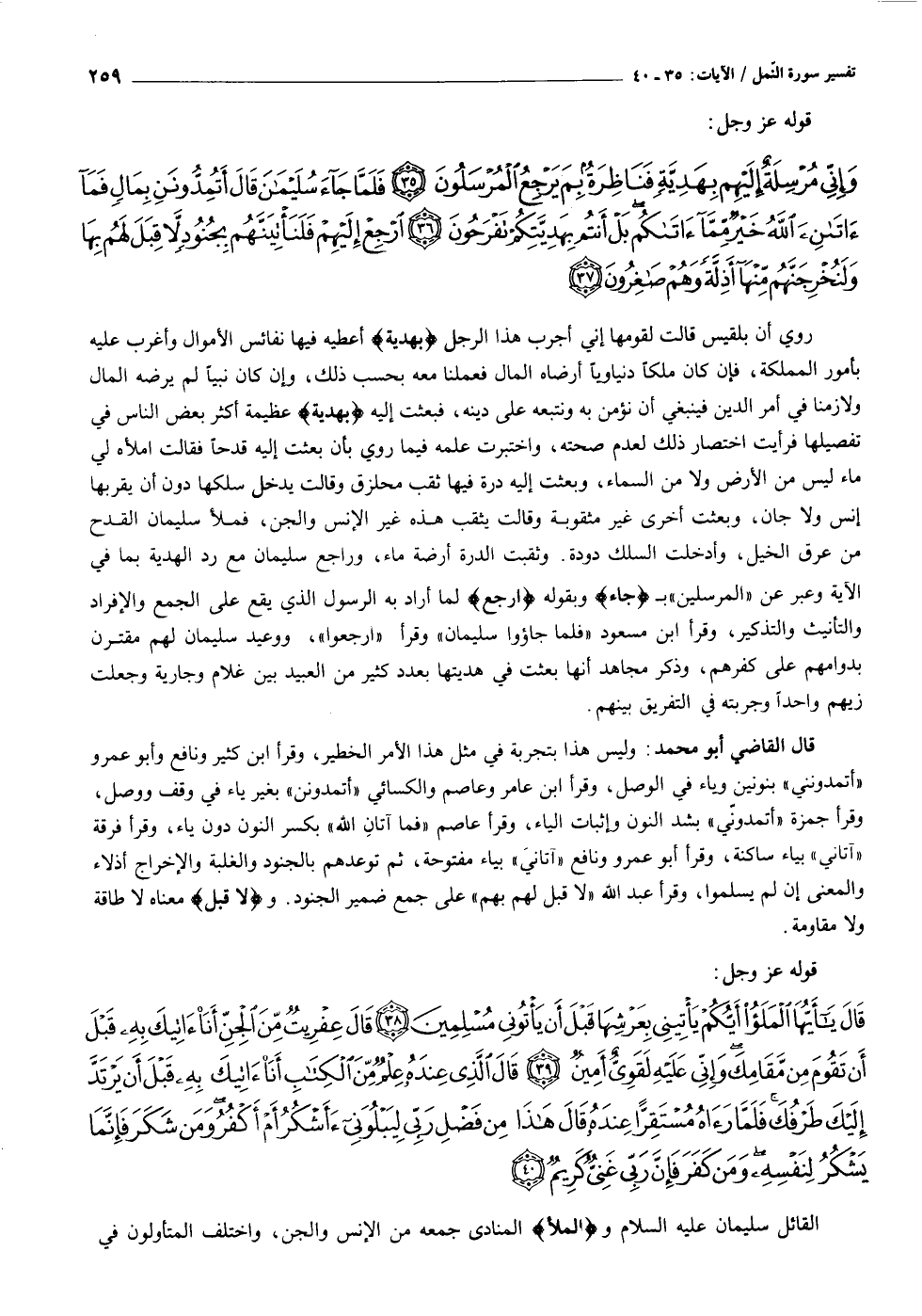 وَإِنِّي مُرْسِلَةٌ إِلَيْهِمْ بِهَدِيَّةٍ فَناظِرَةٌ بِمَ يَرْجِعُ الْمُرْسَلُونَ (٣٥) فَلَمَّا جاءَ سُلَيْمانَ قالَ أَتُمِدُّونَنِ بِمالٍ فَما آتانِيَ اللَّهُ خَيْرٌ مِمَّا آتاكُمْ بَلْ أَنْتُمْ بِهَدِيَّتِكُمْ تَفْرَحُونَ (٣٦) ارْجِعْ إِلَيْهِمْ فَلَنَأْتِيَنَّهُمْ بِجُنُودٍ لا قِبَلَ لَهُمْ بِها وَلَنُخْرِجَنَّهُمْ مِنْها أَذِلَّةً وَهُمْ صاغِرُونَ (٣٧)