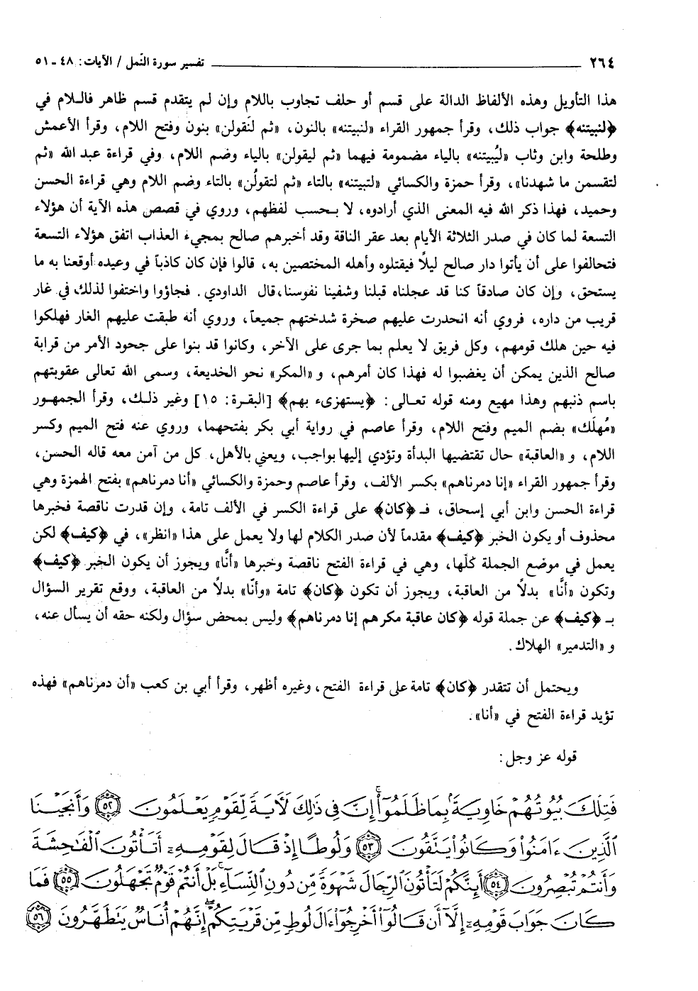 هذا التأويل وهذه الألفاظ الدالة على قسم أو حلف تجاوب باللام وإن لم يتقدم قسم ظاهر فاللام في لَنُبَيِّتَنَّهُ جواب ذلك، وقرأ جمهور القراء «لنبيتنه» بالنون، «ثم لنقولن» بنون وفتح اللام، وقرأ الأعمش وطلحة وابن وثاب «ليبيتنه» بالياء مضمومة فيهما «ثم ليقولن» بالياء وضم اللام، وفي قراءة عبد الله «ثم لتقسمن ما شهدنا» ، وقرأ حمزة والكسائي «لتبيتنه» بالتاء «ثم لتقولن» بالتاء وضم اللام وهي قراءة الحسن وحميد، فهذا ذكر الله فيه المعنى الذي أرادوه، لا بحسب لفظهم، وروي في قصص هذه الآية أن هؤلاء التسعة لما كان في صدر الثلاثة الأيام بعد عقر الناقة وقد أخبرهم صالح بمجيء العذاب اتفق هؤلاء التسعة فتحالفوا على أن يأتوا دار صالح ليلا فيقتلوه وأهله المختصين به، قالوا فإن كان كاذبا في وعيده أوقعنا به ما يستحق، وإن كان صادقا كنا قد عجلناه قبلنا وشفينا نفوسنا، قال الداودي. فجاؤوا واختفوا لذلك في غار قريب من داره، فروي أنه انحدرت عليهم صخرة شدختهم جميعا، وروي أنه طبقت عليهم الغار فهلكوا فيه حين هلك قومهم، وكل فريق لا يعلم بما جرى على الآخر، وكانوا قد بنوا على جحود الأمر من قرابة صالح الذين يمكن أن يغضبوا له فهذا كان أمرهم، و «المكر» نحو الخديعة، وسمى الله تعالى عقوبتهم باسم ذنبهم وهذا مهيع ومنه قوله تعالى: يَسْتَهْزِئُ بِهِمْ [البقرة: ١٥] وغير ذلك، وقرأ الجمهور «مهلك» بضم الميم وفتح اللام، وقرأ عاصم في رواية أبي بكر بفتحهما، وروي عنه فتح الميم وكسر اللام، و «العاقبة» حال تقتضيها البدأة وتؤدي إليها بواجب، ويعني بالأهل، كل من آمن معه قاله الحسن، وقرأ جمهور القراء «إنا دمرناهم» بكسر الألف، وقرأ عاصم وحمزة والكسائي «أنا دمرناهم» بفتح الهمزة وهي قراءة الحسن وابن أبي إسحاق، ف كانَ على قراءة الكسر في الألف تامة، وإن قدرت ناقصة فخبرها محذوف أو يكون الخبر كَيْفَ مقدما لأن صدر الكلام لها ولا يعمل على هذا «انظر» ، في كَيْفَ لكن يعمل في موضع الجملة كلّها، وهي في قراءة الفتح ناقصة وخبرها «أنّا» ويجوز أن يكون الخبر كَيْفَ وتكون «أنّا» بدلا من العاقبة، ويجوز أن تكون كانَ تامة «وأنّا» بدلا من العاقبة، ووقع تقرير السؤال ب كَيْفَ عن جملة قوله كانَ عاقِبَةُ مَكْرِهِمْ أَنَّا دَمَّرْناهُمْ وليس بمحض سؤال ولكنه حقه أن يسأل عنه، و «التدمير» الهلاك.