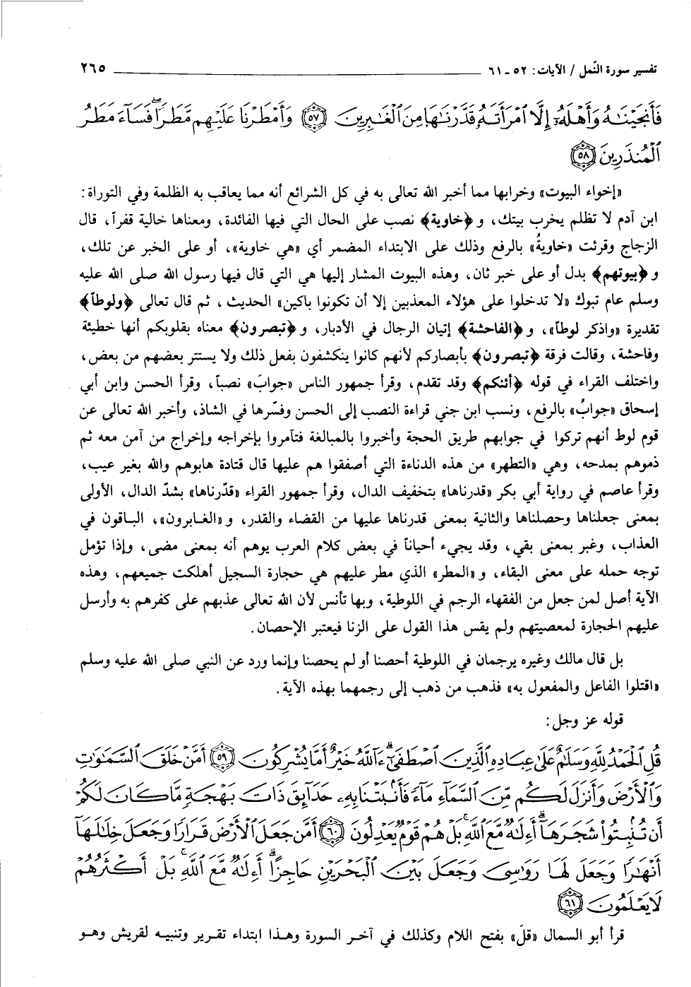 ابن آدم لا تظلم يخرب بيتك، وخاوِيَةً نصب على الحال التي فيها الفائدة، ومعناها خالية قفرا، قال الزجاج وقرئت «خاوية» بالرفع وذلك على الابتداء المضمر أي «هي خاوية» ، أو على الخبر عن تلك، وبُيُوتُهُمْ بدل أو على خبر ثان، وهذه البيوت المشار إليها هي التي قال فيها رسول الله صلى الله عليه وسلم عام تبوك «لا تدخلوا على هؤلاء المعذبين إلا أن تكونوا باكين» الحديث، ثم قال تعالى وَلُوطاً تقديرة «واذكر لوطا» ، والْفاحِشَةَ إتيان الرجال في الأدبار، وتُبْصِرُونَ معناه بقلوبكم أنها خطيئة وفاحشة، وقالت فرقة تُبْصِرُونَ بأبصاركم لأنهم كانوا ينكشفون بفعل ذلك ولا يستتر بعضهم من بعض، واختلف القراء في قوله أَإِنَّكُمْ وقد تقدم، وقرأ جمهور الناس «جواب» نصبا، وقرأ الحسن وابن أبي إسحاق «جواب» بالرفع، ونسب ابن جني قراءة النصب إلى الحسن وفسّرها في الشاذ، وأخبر الله تعالى عن قوم لوط أنهم تركوا في جوابهم طريق الحجة وأخبروا بالمبالغة فتأمروا بإخراجه وإخراج من آمن معه ثم ذموهم بمدحه، وهي «التطهر» من هذه الدناءة التي أصفقوا هم عليها قال قتادة هابوهم والله بغير عيب، وقرأ عاصم في رواية أبي بكر «قدرناها» بتخفيف الدال، وقرأ جمهور القراء «قدّرناها» بشدّ الدال، الأولى بمعنى جعلناها وحصلناها والثانية بمعنى قدرناها عليها من القضاء والقدر، و «الغابرون» ، الباقون في العذاب، وغبر بمعنى بقي، وقد يجيء أحيانا في بعض كلام العرب يوهم أنه بمعنى مضى، وإذا تؤمل توجه حمله على معنى البقاء، و «المطر» الذي مطر عليهم هي حجارة السجيل أهلكت جميعهم، وهذه الآية أصل لمن جعل من الفقهاء الرجم في اللوطية، وبها تأنس لأن الله تعالى عذبهم على كفرهم به وأرسل عليهم الحجارة لمعصيتهم ولم يقس هذا القول على الزنا فيعتبر الإحصان.