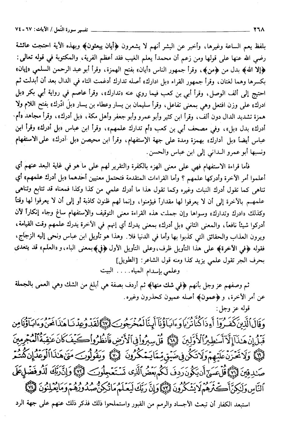 وَقالَ الَّذِينَ كَفَرُوا أَإِذا كُنَّا تُراباً وَآباؤُنا أَإِنَّا لَمُخْرَجُونَ (٦٧) لَقَدْ وُعِدْنا هذا نَحْنُ وَآباؤُنا مِنْ قَبْلُ إِنْ هذا إِلاَّ أَساطِيرُ الْأَوَّلِينَ (٦٨) قُلْ سِيرُوا فِي الْأَرْضِ فَانْظُرُوا كَيْفَ كانَ عاقِبَةُ الْمُجْرِمِينَ (٦٩) وَلا تَحْزَنْ عَلَيْهِمْ وَلا تَكُنْ فِي ضَيْقٍ مِمَّا يَمْكُرُونَ (٧٠) وَيَقُولُونَ مَتى هذَا الْوَعْدُ إِنْ كُنْتُمْ صادِقِينَ (٧١)
