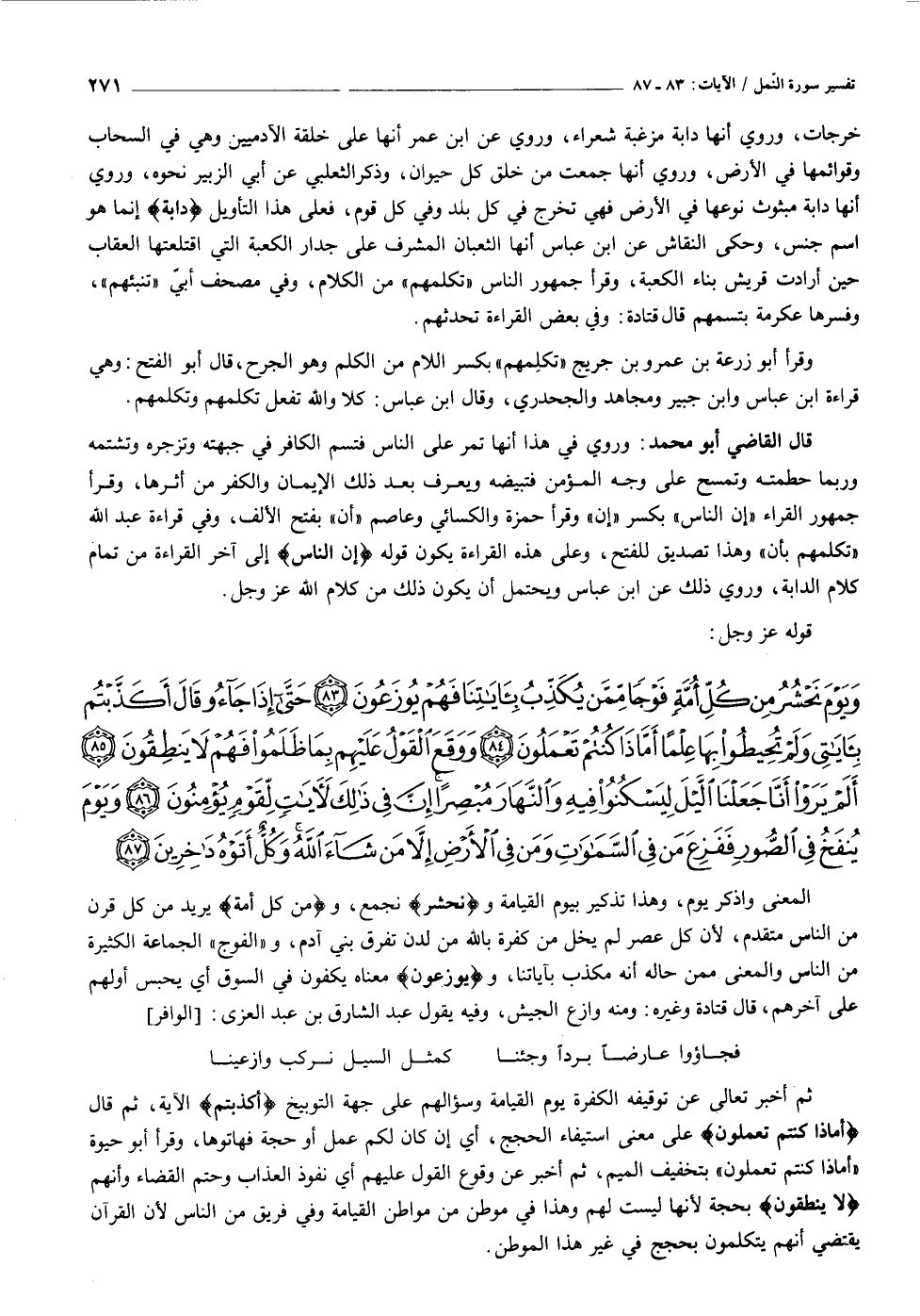 وَيَوْمَ نَحْشُرُ مِنْ كُلِّ أُمَّةٍ فَوْجاً مِمَّنْ يُكَذِّبُ بِآياتِنا فَهُمْ يُوزَعُونَ (٨٣) حَتَّى إِذا جاؤُ قالَ أَكَذَّبْتُمْ بِآياتِي وَلَمْ تُحِيطُوا بِها عِلْماً أَمَّا ذا كُنْتُمْ تَعْمَلُونَ (٨٤) وَوَقَعَ الْقَوْلُ عَلَيْهِمْ بِما ظَلَمُوا فَهُمْ لا يَنْطِقُونَ (٨٥) أَلَمْ يَرَوْا أَنَّا جَعَلْنَا اللَّيْلَ لِيَسْكُنُوا فِيهِ وَالنَّهارَ مُبْصِراً إِنَّ فِي ذلِكَ لَآياتٍ لِقَوْمٍ يُؤْمِنُونَ (٨٦) وَيَوْمَ يُنْفَخُ فِي الصُّورِ فَفَزِعَ مَنْ فِي السَّماواتِ وَمَنْ فِي الْأَرْضِ إِلاَّ مَنْ شاءَ اللَّهُ وَكُلٌّ أَتَوْهُ داخِرِينَ (٨٧)