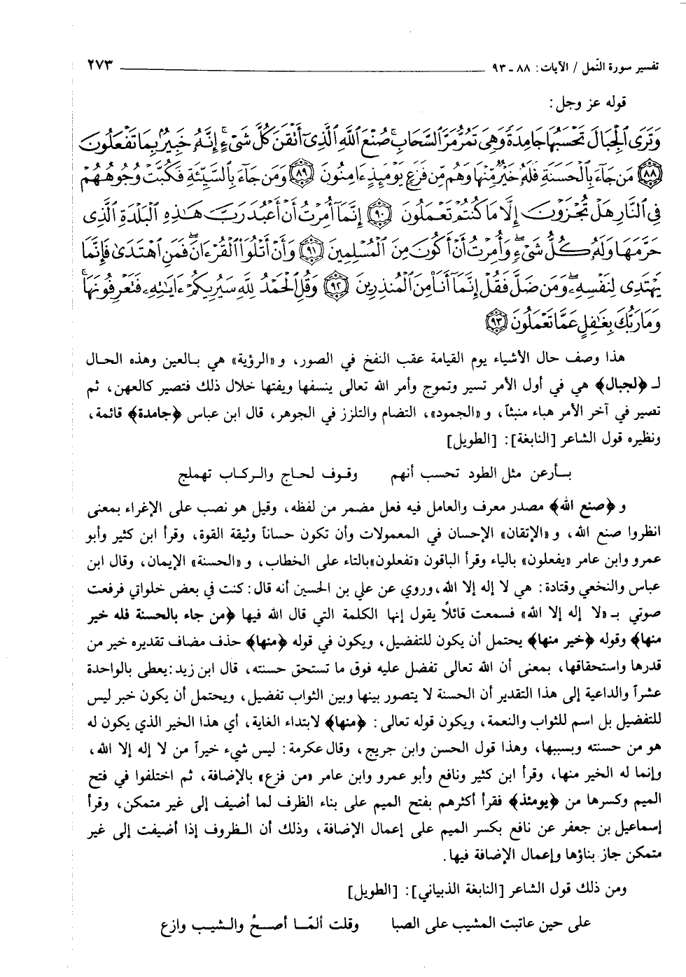 وَتَرَى الْجِبالَ تَحْسَبُها جامِدَةً وَهِيَ تَمُرُّ مَرَّ السَّحابِ صُنْعَ اللَّهِ الَّذِي أَتْقَنَ كُلَّ شَيْءٍ إِنَّهُ خَبِيرٌ بِما تَفْعَلُونَ (٨٨) مَنْ جاءَ بِالْحَسَنَةِ فَلَهُ خَيْرٌ مِنْها وَهُمْ مِنْ فَزَعٍ يَوْمَئِذٍ آمِنُونَ (٨٩) وَمَنْ جاءَ بِالسَّيِّئَةِ فَكُبَّتْ وُجُوهُهُمْ فِي النَّارِ هَلْ تُجْزَوْنَ إِلاَّ ما كُنْتُمْ تَعْمَلُونَ (٩٠) إِنَّما أُمِرْتُ أَنْ أَعْبُدَ رَبَّ هذِهِ الْبَلْدَةِ الَّذِي حَرَّمَها وَلَهُ كُلُّ شَيْءٍ وَأُمِرْتُ أَنْ أَكُونَ مِنَ الْمُسْلِمِينَ (٩١) وَأَنْ أَتْلُوَا الْقُرْآنَ فَمَنِ اهْتَدى فَإِنَّما يَهْتَدِي لِنَفْسِهِ وَمَنْ ضَلَّ فَقُلْ إِنَّما أَنَا مِنَ الْمُنْذِرِينَ (٩٢)