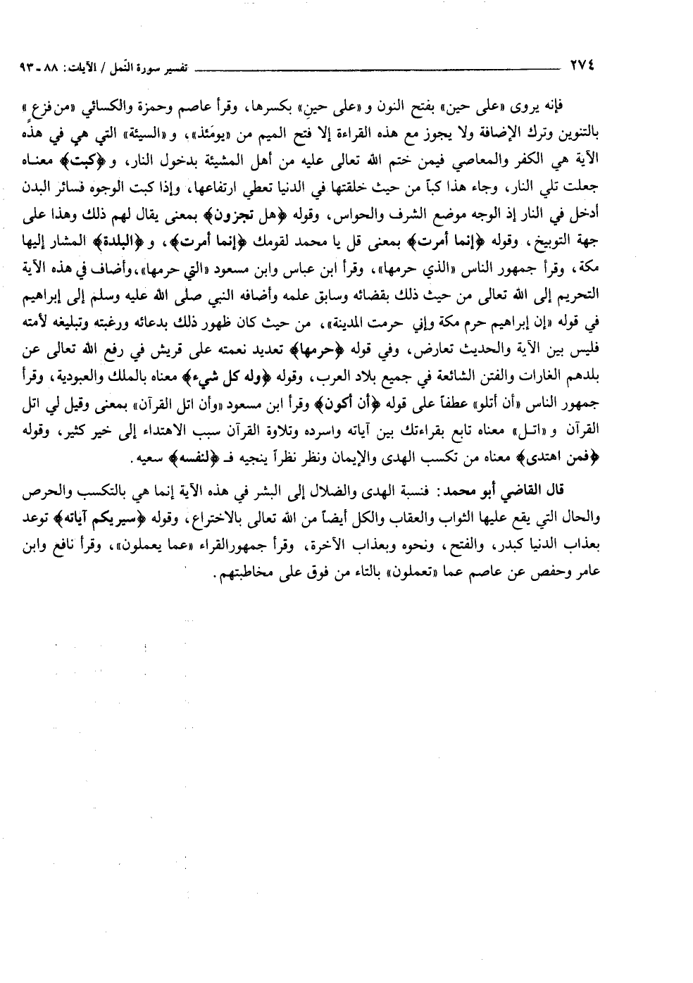 فإنه يروى «على حين» بفتح النون و «على حين» بكسرها، وقرأ عاصم وحمزة والكسائي «من فزع» بالتنوين وترك الإضافة ولا يجوز مع هذه القراءة إلا فتح الميم من «يومئذ» ، و «السيئة» التي هي في هذه الآية هي الكفر والمعاصي فيمن ختم الله تعالى عليه من أهل المشيئة بدخول النار، و «كبت» معناه جعلت تلي النار، وجاء هذا كبا من حيث خلقتها في الدنيا تعطي ارتفاعها، وإذا كبت الوجوه فسائر البدن أدخل في النار إذ الوجه موضع الشرف والحواس، وقوله هَلْ تُجْزَوْنَ بمعنى يقال لهم ذلك وهذا على جهة التوبيخ، وقوله إِنَّما أُمِرْتُ بمعنى قل يا محمد لقومك إِنَّما أُمِرْتُ، والْبَلْدَةِ المشار إليها مكة، وقرأ جمهور الناس «الذي حرمها» ، وقرأ ابن عباس وابن مسعود «التي حرمها» ، وأضاف في هذه الآية التحريم إلى الله تعالى من حيث ذلك بقضائه وسابق علمه وأضافه النبي صلى الله عليه وسلم إلى إبراهيم في قوله «إن إبراهيم حرم مكة وإني حرمت المدينة» ، من حيث كان ظهور ذلك بدعائه ورغبته وتبليغه لأمته فليس بين الآية والحديث تعارض، وفي قوله حَرَّمَها تعديد نعمته على قريش في رفع الله تعالى عن بلدهم الغارات والفتن الشائعة في جميع بلاد العرب، وقوله وَلَهُ كُلُّ شَيْءٍ معناه بالملك والعبودية، وقرأ جمهور الناس «أن أتلو» عطفا على قوله أَنْ أَكُونَ وقرأ ابن مسعود «وأن اتل القرآن» بمعنى وقيل لي اتل القرآن و «اتل» معناه تابع بقراءتك بين آياته واسرده وتلاوة القرآن سبب الاهتداء إلى خير كثير، وقوله فَمَنِ اهْتَدى معناه من تكسب الهدى والإيمان ونظر نظرا ينجيه ف لِنَفْسِهِ سعيه.