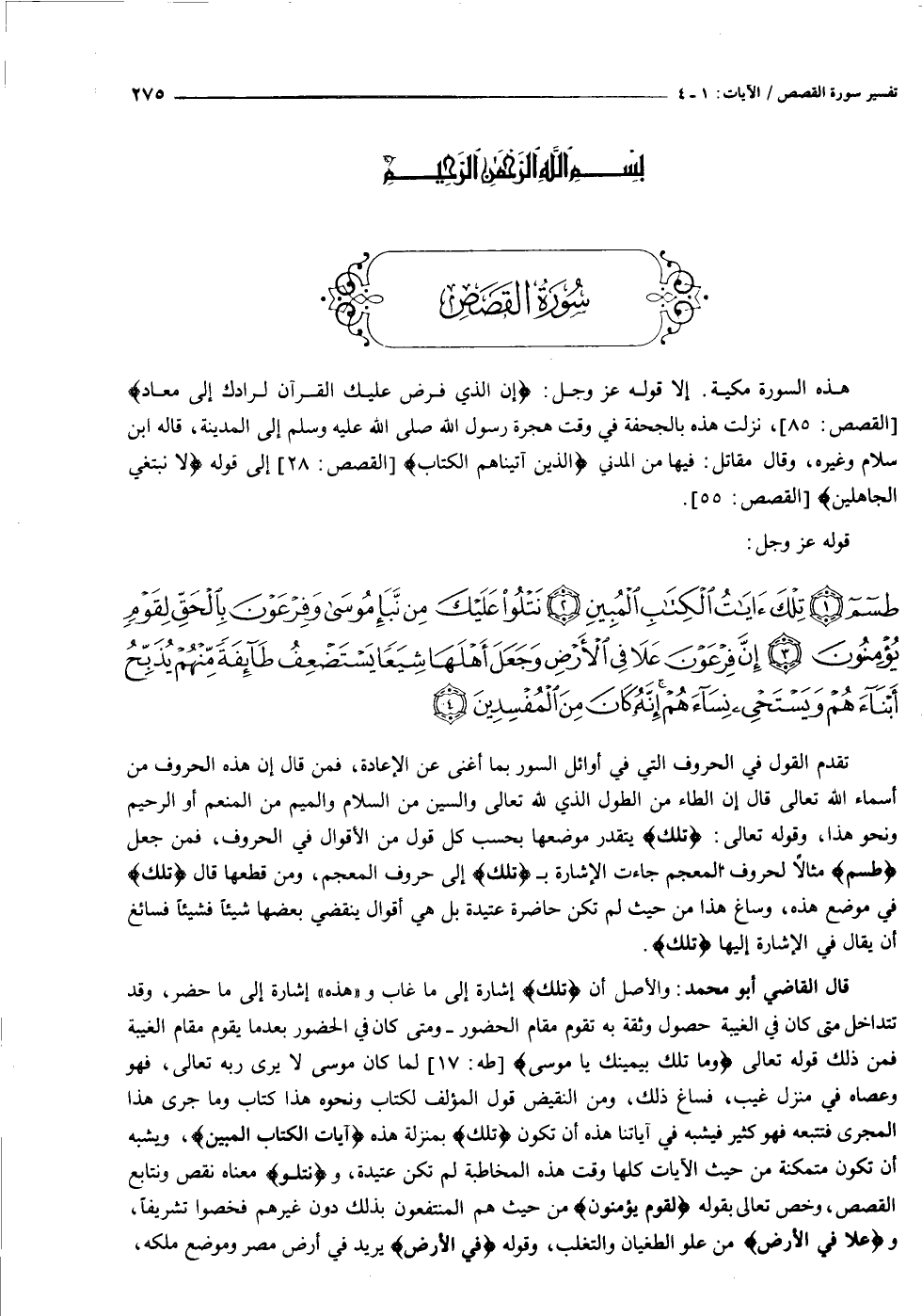 قال القاضي أبو محمد: والأصل أن تِلْكَ إشارة إلى ما غاب و «هذه» إشارة إلى ما حضر، وقد تتداخل متى كان في الغيبة حصول وثقة به تقوم مقام الحضور- ومتى كان في الحضور بعد ما يقوم مقام الغيبة فمن ذلك قوله تعالى وَما تِلْكَ بِيَمِينِكَ يا مُوسى [طه: ١٧] لما كان موسى لا يرى ربه تعالى، فهو وعصاه في منزل غيب، فساغ ذلك، ومن النقيض قول المؤلف لكتاب ونحوه هذا كتاب وما جرى هذا المجرى فتتبعه فهو كثير فيشبه في آياتنا هذه أن تكون تِلْكَ بمنزلة هذه آياتُ الْكِتابِ الْمُبِينِ، ويشبه أن تكون متمكنة من حيث الآيات كلها وقت هذه المخاطبة لم تكن عتيدة، ونَتْلُوا معناه نقص ونتابع القصص، وخص تعالى بقوله لِقَوْمٍ يُؤْمِنُونَ من حيث هم المنتفعون بذلك دون غيرهم فخصوا تشريفا، وعَلا فِي الْأَرْضِ من علو الطغيان والتغلب، وقوله فِي الْأَرْضِ يريد في أرض مصر وموضع ملكه،