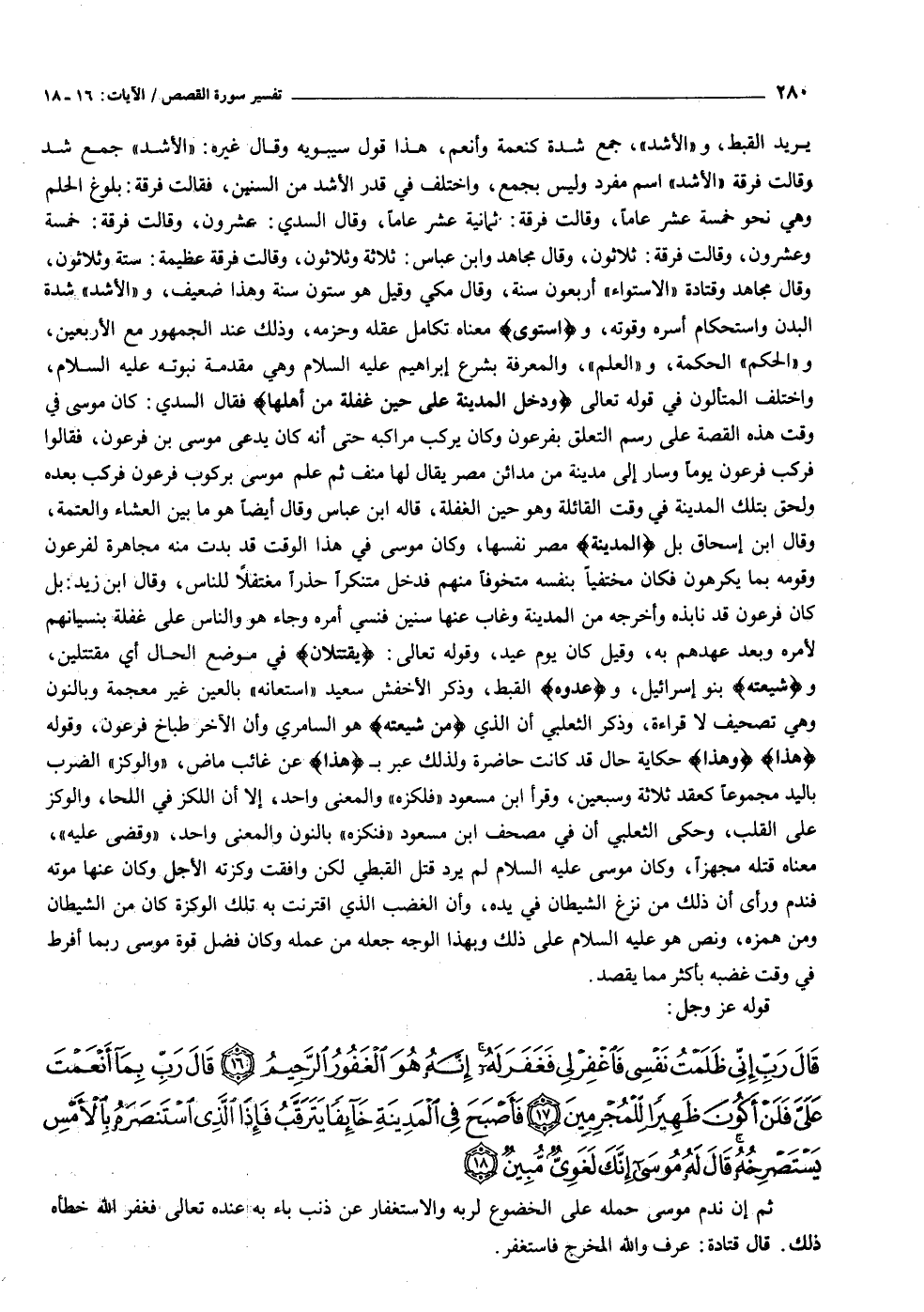 قالَ رَبِّ إِنِّي ظَلَمْتُ نَفْسِي فَاغْفِرْ لِي فَغَفَرَ لَهُ إِنَّهُ هُوَ الْغَفُورُ الرَّحِيمُ (١٦) قالَ رَبِّ بِما أَنْعَمْتَ عَلَيَّ فَلَنْ أَكُونَ ظَهِيراً لِلْمُجْرِمِينَ (١٧) فَأَصْبَحَ فِي الْمَدِينَةِ خائِفاً يَتَرَقَّبُ فَإِذَا الَّذِي اسْتَنْصَرَهُ بِالْأَمْسِ يَسْتَصْرِخُهُ قالَ لَهُ مُوسى إِنَّكَ لَغَوِيٌّ مُبِينٌ (١٨)