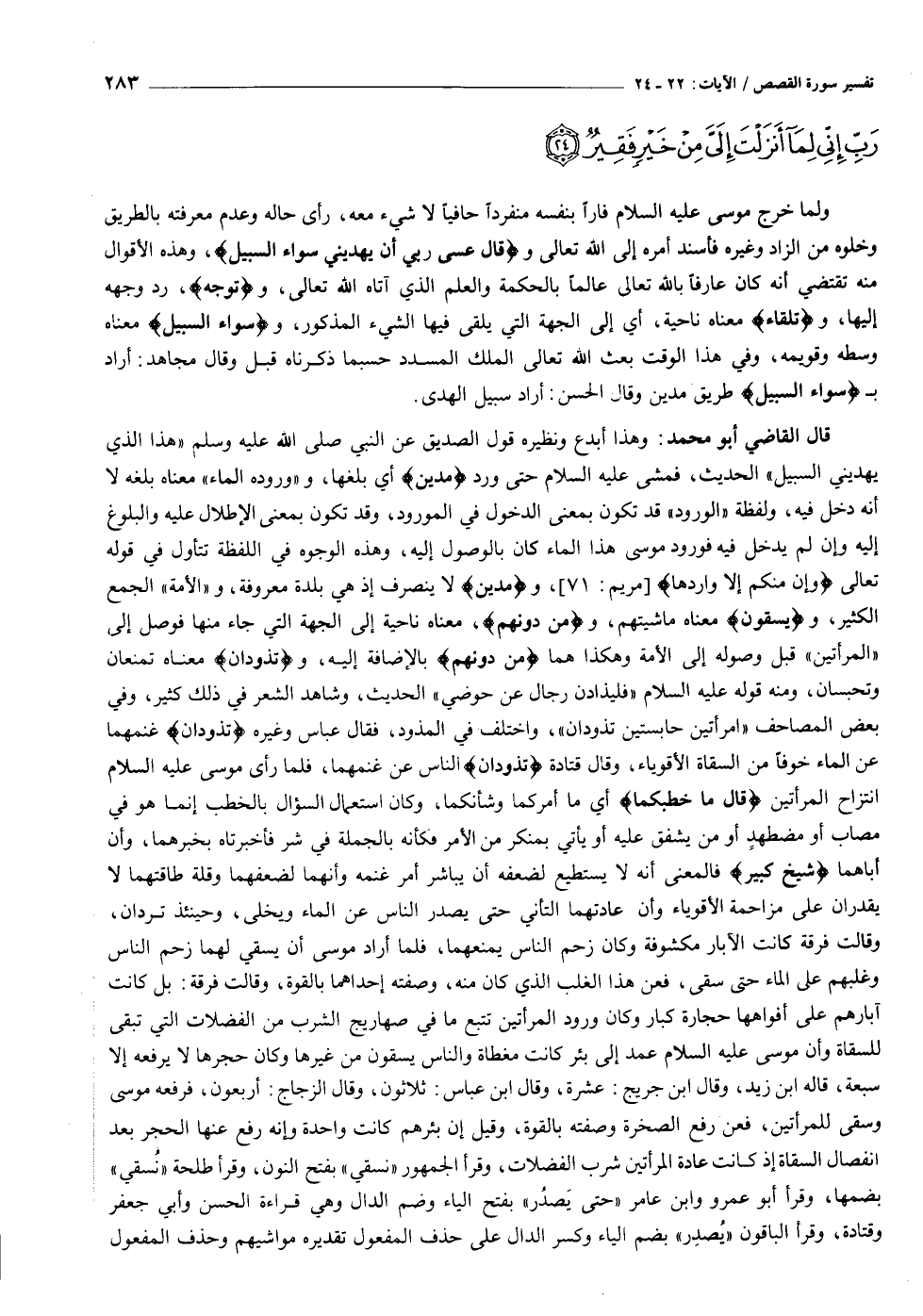قال القاضي أبو محمد: وهذا أبدع ونظيره قول الصديق عن النبي صلى الله عليه وسلم «هذا الذي يهديني السبيل» الحديث، فمشى عليه السلام حتى ورد مَدْيَنَ أي بلغها، و «وروده الماء» معناه بلغه لا أنه دخل فيه، ولفظة «الورود» قد تكون بمعنى الدخول في المورود، وقد تكون بمعنى الإطلال عليه والبلوغ إليه وإن لم يدخل فيه فورود موسى هذا الماء كان بالوصول إليه، وهذه الوجوه في اللفظة تتأول في قوله تعالى وَإِنْ مِنْكُمْ إِلَّا وارِدُها [مريم: ٧١] ، ومَدْيَنَ لا ينصرف إذ هي بلدة معروفة، و «الأمة» الجمع الكثير، ويَسْقُونَ معناه ماشيتهم، ومِنْ دُونِهِمُ، معناه ناحية إلى الجهة التي جاء منها فوصل إلى «المرأتين» قبل وصوله إلى الأمة وهكذا هما مِنْ دُونِهِمُ بالإضافة إليه، وتَذُودانِ معناه تمنعان وتحبسان، ومنه قوله عليه السلام «فليذادن رجال عن حوضي» الحديث، وشاهد الشعر في ذلك كثير، وفي بعض المصاحف «امرأتين حابستين تذودان» ، واختلف في المذود، فقال عباس وغيره تَذُودانِ غنمهما عن الماء خوفا من السقاة الأقوياء، وقال قتادة تَذُودانِ الناس عن غنمهما، فلما رأى موسى عليه السلام انتزاح المرأتين قالَ ما خَطْبُكُما أي ما أمركما وشأنكما، وكان استعمال السؤال بالخطب إنما هو في مصاب أو مضطهد أو من يشفق عليه أو يأتي بمنكر من الأمر فكأنه بالجملة في شر فأخبرتاه بخبرهما، وأن أباهما شَيْخٌ كَبِيرٌ فالمعنى أنه لا يستطيع لضعفه أن يباشر أمر غنمه وأنهما لضعفهما وقلة طاقتهما لا يقدران على مزاحمة الأقوياء وأن عادتهما التأتي حتى يصدر الناس عن الماء ويخلى، وحينئذ تردان، وقالت فرقة كانت الآبار مكشوفة وكان زحم الناس يمنعهما، فلما أراد موسى أن يسقي لهما زحم الناس وغلبهم على الماء حتى سقى، فعن هذا الغلب الذي كان منه، وصفته إحداهما بالقوة، وقالت فرقة: بل كانت آبارهم على أفواهها حجارة كبار وكان ورود المرأتين تتبع ما في صهاريج الشرب من الفضلات التي تبقى للسقاة وأن موسى عليه السلام عمد إلى بئر كانت مغطاة والناس يسقون من غيرها وكان حجرها لا يرفعه إلا سبعة، قاله ابن زيد، وقال ابن جريج: عشرة، وقال ابن عباس: ثلاثون، وقال الزجاج: أربعون، فرفعه موسى وسقى للمرأتين، فعن رفع الصخرة وصفته بالقوة، وقيل إن بئرهم كانت واحدة وإنه رفع عنها الحجر بعد انفصال السقاة إذ كانت عادة المرأتين شرب الفضلات، وقرأ الجمهور «نسقي» بفتح النون، وقرأ طلحة «نسقي» بضمها، وقرأ أبو عمرو وابن عامر «حتى يصدر» بفتح الياء وضم الدال وهي قراءة الحسن وأبي جعفر وقتادة، وقرأ الباقون «يصدر» بضم الياء وكسر الدال على حذف المفعول تقديره مواشيهم وحذف المفعول