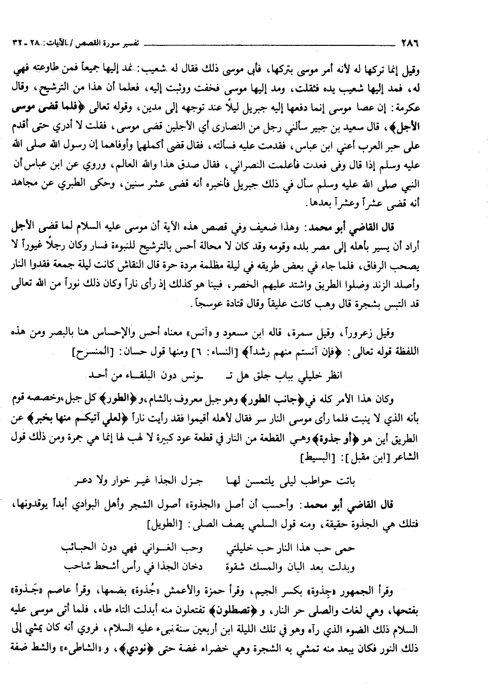 وكان هذا الأمر كله في جانِبِ الطُّورِ وهو جبل معروف بالشام، والطُّورِ كل جبل، وخصصه قوم بأنه الذي لا ينبت فلما رأى موسى النار سر فقال لأهله أقيموا فقد رأيت نارا لَعَلِّي آتِيكُمْ مِنْها بِخَبَرٍ عن الطريق أين هو أَوْ جَذْوَةٍ وهي القطعة من النار في قطعة عود كبيرة لا لهب لها إنما هي جمرة ومن ذلك قول الشاعر [ابن مقبل] : [البسيط]