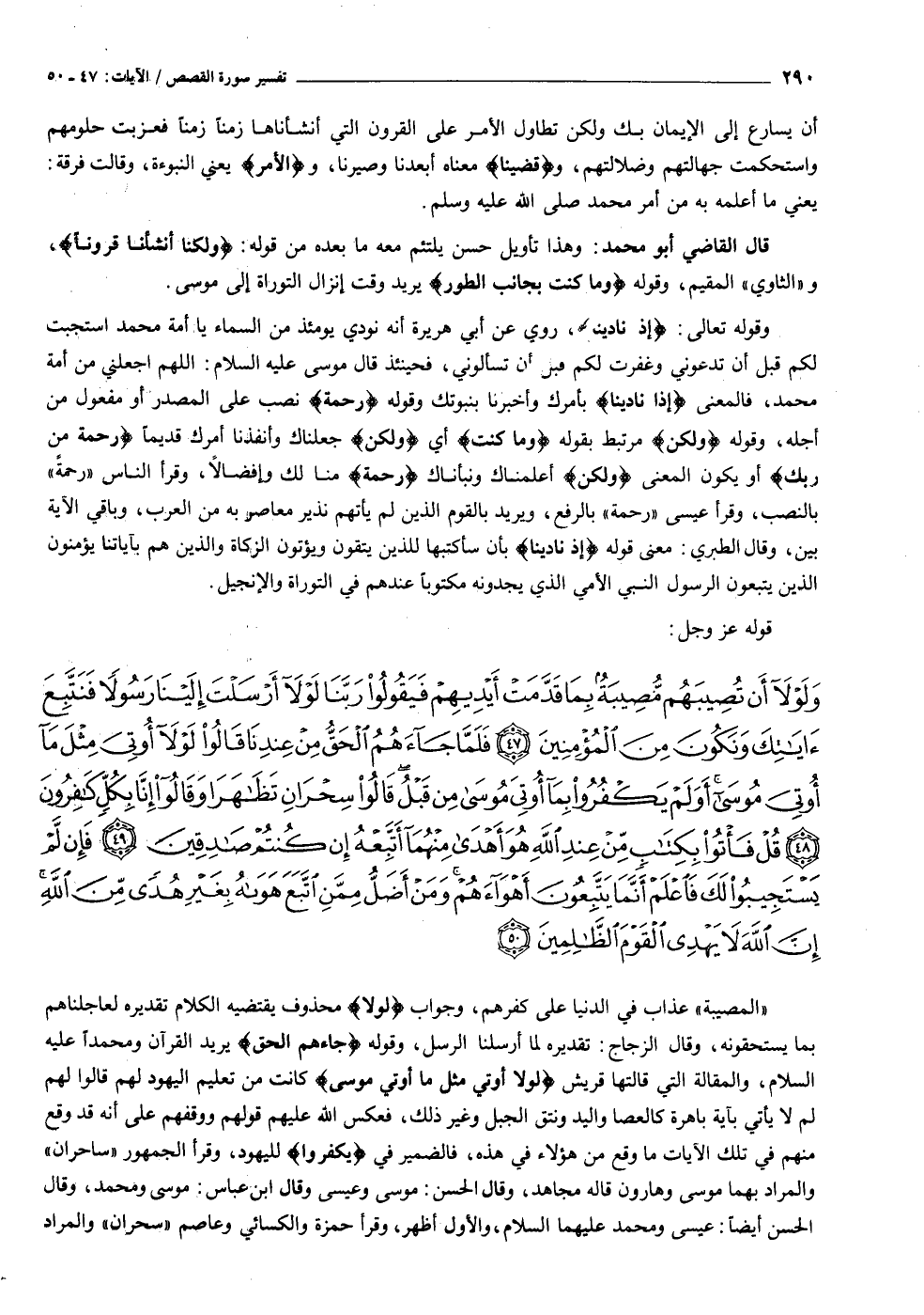 وَلَوْلا أَنْ تُصِيبَهُمْ مُصِيبَةٌ بِما قَدَّمَتْ أَيْدِيهِمْ فَيَقُولُوا رَبَّنا لَوْلا أَرْسَلْتَ إِلَيْنا رَسُولاً فَنَتَّبِعَ آياتِكَ وَنَكُونَ مِنَ الْمُؤْمِنِينَ (٤٧) فَلَمَّا جاءَهُمُ الْحَقُّ مِنْ عِنْدِنا قالُوا لَوْلا أُوتِيَ مِثْلَ ما أُوتِيَ مُوسى أَوَلَمْ يَكْفُرُوا بِما أُوتِيَ مُوسى مِنْ قَبْلُ قالُوا سِحْرانِ تَظاهَرا وَقالُوا إِنَّا بِكُلٍّ كافِرُونَ (٤٨) قُلْ فَأْتُوا بِكِتابٍ مِنْ عِنْدِ اللَّهِ هُوَ أَهْدى مِنْهُما أَتَّبِعْهُ إِنْ كُنْتُمْ صادِقِينَ (٤٩) فَإِنْ لَمْ يَسْتَجِيبُوا لَكَ فَاعْلَمْ أَنَّما يَتَّبِعُونَ أَهْواءَهُمْ وَمَنْ أَضَلُّ مِمَّنِ اتَّبَعَ هَواهُ بِغَيْرِ هُدىً مِنَ اللَّهِ إِنَّ اللَّهَ لا يَهْدِي الْقَوْمَ الظَّالِمِينَ (٥٠)