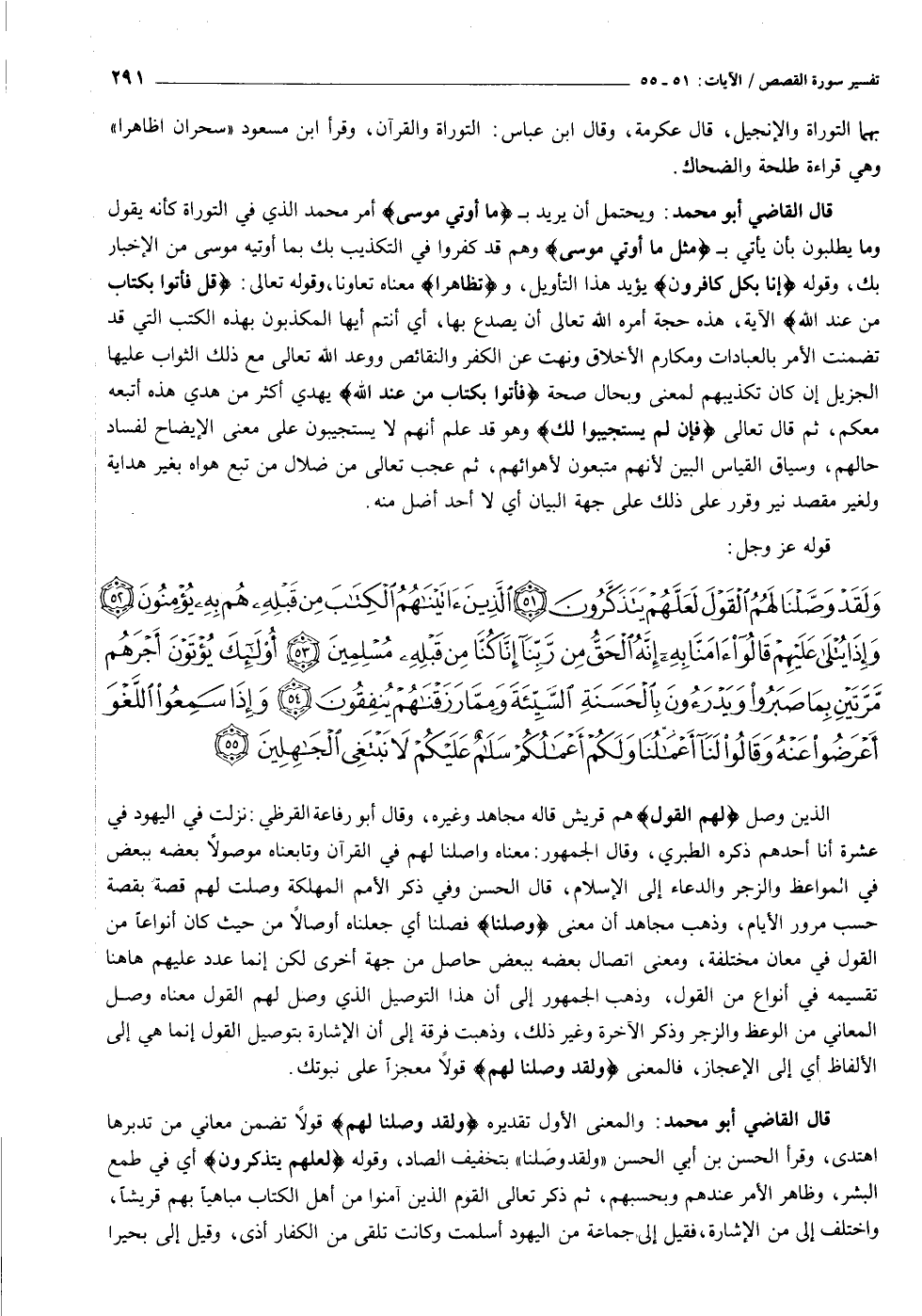 وَلَقَدْ وَصَّلْنا لَهُمُ الْقَوْلَ لَعَلَّهُمْ يَتَذَكَّرُونَ (٥١) الَّذِينَ آتَيْناهُمُ الْكِتابَ مِنْ قَبْلِهِ هُمْ بِهِ يُؤْمِنُونَ (٥٢) وَإِذا يُتْلى عَلَيْهِمْ قالُوا آمَنَّا بِهِ إِنَّهُ الْحَقُّ مِنْ رَبِّنا إِنَّا كُنَّا مِنْ قَبْلِهِ مُسْلِمِينَ (٥٣) أُولئِكَ يُؤْتَوْنَ أَجْرَهُمْ مَرَّتَيْنِ بِما صَبَرُوا وَيَدْرَؤُنَ بِالْحَسَنَةِ السَّيِّئَةَ وَمِمَّا رَزَقْناهُمْ يُنْفِقُونَ (٥٤) وَإِذا سَمِعُوا اللَّغْوَ أَعْرَضُوا عَنْهُ وَقالُوا لَنا أَعْمالُنا وَلَكُمْ أَعْمالُكُمْ سَلامٌ عَلَيْكُمْ لا نَبْتَغِي الْجاهِلِينَ (٥٥)