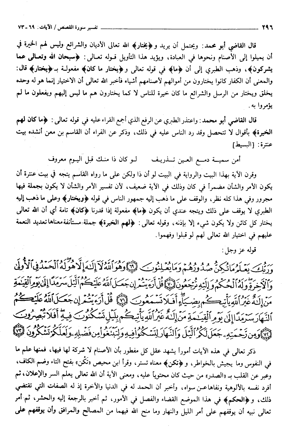 وَرَبُّكَ يَعْلَمُ ما تُكِنُّ صُدُورُهُمْ وَما يُعْلِنُونَ (٦٩) وَهُوَ اللَّهُ لا إِلهَ إِلاَّ هُوَ لَهُ الْحَمْدُ فِي الْأُولى وَالْآخِرَةِ وَلَهُ الْحُكْمُ وَإِلَيْهِ تُرْجَعُونَ (٧٠) قُلْ أَرَأَيْتُمْ إِنْ جَعَلَ اللَّهُ عَلَيْكُمُ اللَّيْلَ سَرْمَداً إِلى يَوْمِ الْقِيامَةِ مَنْ إِلهٌ غَيْرُ اللَّهِ يَأْتِيكُمْ بِضِياءٍ أَفَلا تَسْمَعُونَ (٧١) قُلْ أَرَأَيْتُمْ إِنْ جَعَلَ اللَّهُ عَلَيْكُمُ النَّهارَ سَرْمَداً إِلى يَوْمِ الْقِيامَةِ مَنْ إِلهٌ غَيْرُ اللَّهِ يَأْتِيكُمْ بِلَيْلٍ تَسْكُنُونَ فِيهِ أَفَلا تُبْصِرُونَ (٧٢) وَمِنْ رَحْمَتِهِ جَعَلَ لَكُمُ اللَّيْلَ وَالنَّهارَ لِتَسْكُنُوا فِيهِ وَلِتَبْتَغُوا مِنْ فَضْلِهِ وَلَعَلَّكُمْ تَشْكُرُونَ (٧٣)