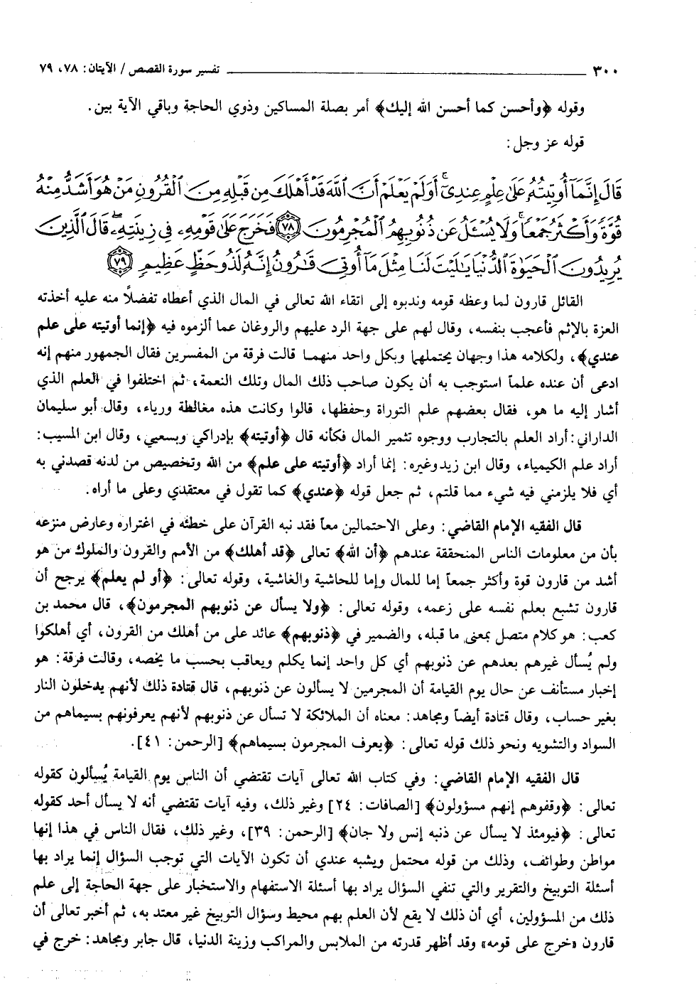 قال الفقيه الإمام القاضي: وفي كتاب الله تعالى آيات تقتضي أن الناس يوم القيامة يسألون كقوله تعالى: وَقِفُوهُمْ إِنَّهُمْ مَسْؤُلُونَ [الصافات: ٢٤] وغير ذلك، وفيه آيات تقتضي أنه لا يسأل أحد كقوله تعالى: فَيَوْمَئِذٍ لا يُسْئَلُ عَنْ ذَنْبِهِ إِنْسٌ وَلا جَانٌّ [الرحمن: ٣٩] ، وغير ذلك، فقال الناس في هذا إنها مواطن وطوائف، وذلك من قوله محتمل ويشبه عندي أن تكون الآيات التي توجب السؤال إنما يراد بها أسئلة التوبيخ والتقرير والتي تنفي السؤال يراد بها أسئلة الاستفهام والاستخبار على جهة الحاجة إلى علم ذلك من المسئولين، أي أن ذلك لا يقع لأن العلم بهم محيط وسؤال التوبيخ غير معتد به، ثم أخبر تعالى أن قارون «خرج على قومه» وقد أظهر قدرته من الملابس والمراكب وزينة الدنيا، قال جابر ومجاهد: خرج في