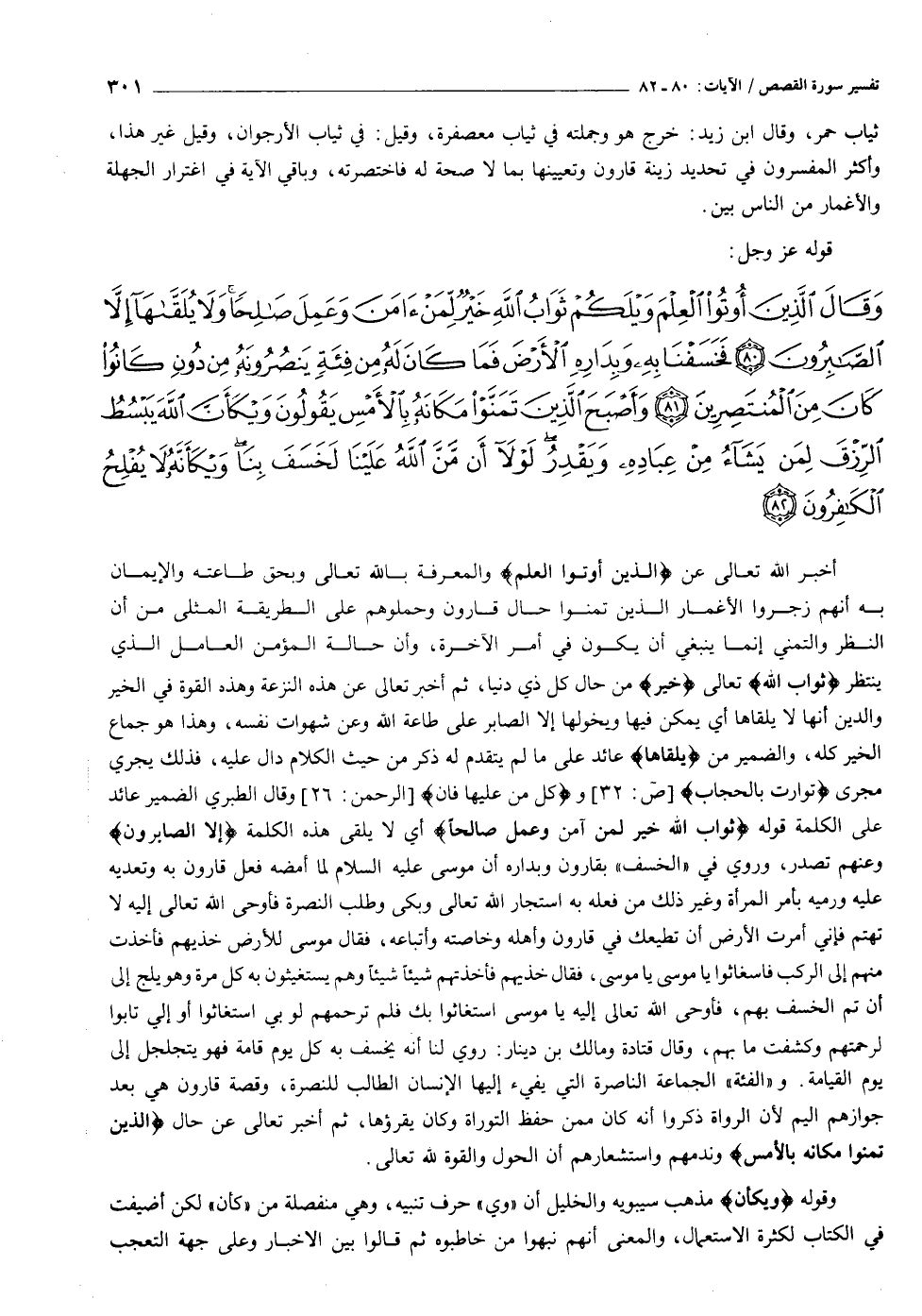 وَقالَ الَّذِينَ أُوتُوا الْعِلْمَ وَيْلَكُمْ ثَوابُ اللَّهِ خَيْرٌ لِمَنْ آمَنَ وَعَمِلَ صالِحاً وَلا يُلَقَّاها إِلاَّ الصَّابِرُونَ (٨٠) فَخَسَفْنا بِهِ وَبِدارِهِ الْأَرْضَ فَما كانَ لَهُ مِنْ فِئَةٍ يَنْصُرُونَهُ مِنْ دُونِ اللَّهِ وَما كانَ مِنَ المُنْتَصِرِينَ (٨١) وَأَصْبَحَ الَّذِينَ تَمَنَّوْا مَكانَهُ بِالْأَمْسِ يَقُولُونَ وَيْكَأَنَّ اللَّهَ يَبْسُطُ الرِّزْقَ لِمَنْ يَشاءُ مِنْ عِبادِهِ وَيَقْدِرُ لَوْلا أَنْ مَنَّ اللَّهُ عَلَيْنا لَخَسَفَ بِنا وَيْكَأَنَّهُ لا يُفْلِحُ الْكافِرُونَ (٨٢)