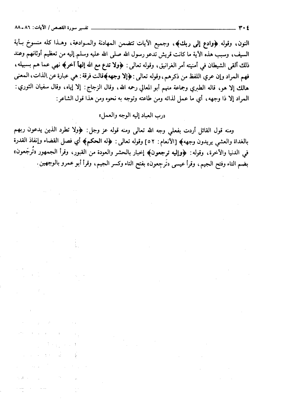النون، وقوله وَادْعُ إِلى رَبِّكَ، وجميع الآيات تتضمن المهادنة والموادعة، وهذا كله منسوخ بآية السيف، وسبب هذه الآية ما كانت قريش تدعو رسول الله صلى الله عليه وسلم إليه من تعظيم أوثانهم وعند ذلك ألقى الشيطان في أمنيته أمر الغرانيق، وقوله تعالى: وَلا تَدْعُ مَعَ اللَّهِ إِلهاً آخَرَ نهي عما هم بسبيله، فهم المراد وإن عري اللفظ من ذكرهم، وقوله تعالى: إِلَّا وَجْهَهُ قالت فرقة: هي عبارة عن الذات، المعنى هالك إلا هو، قاله الطبري وجماعة منهم أبو المعالي رحمه الله، وقال الزجاج: إلا إياه، وقال سفيان الثوري: