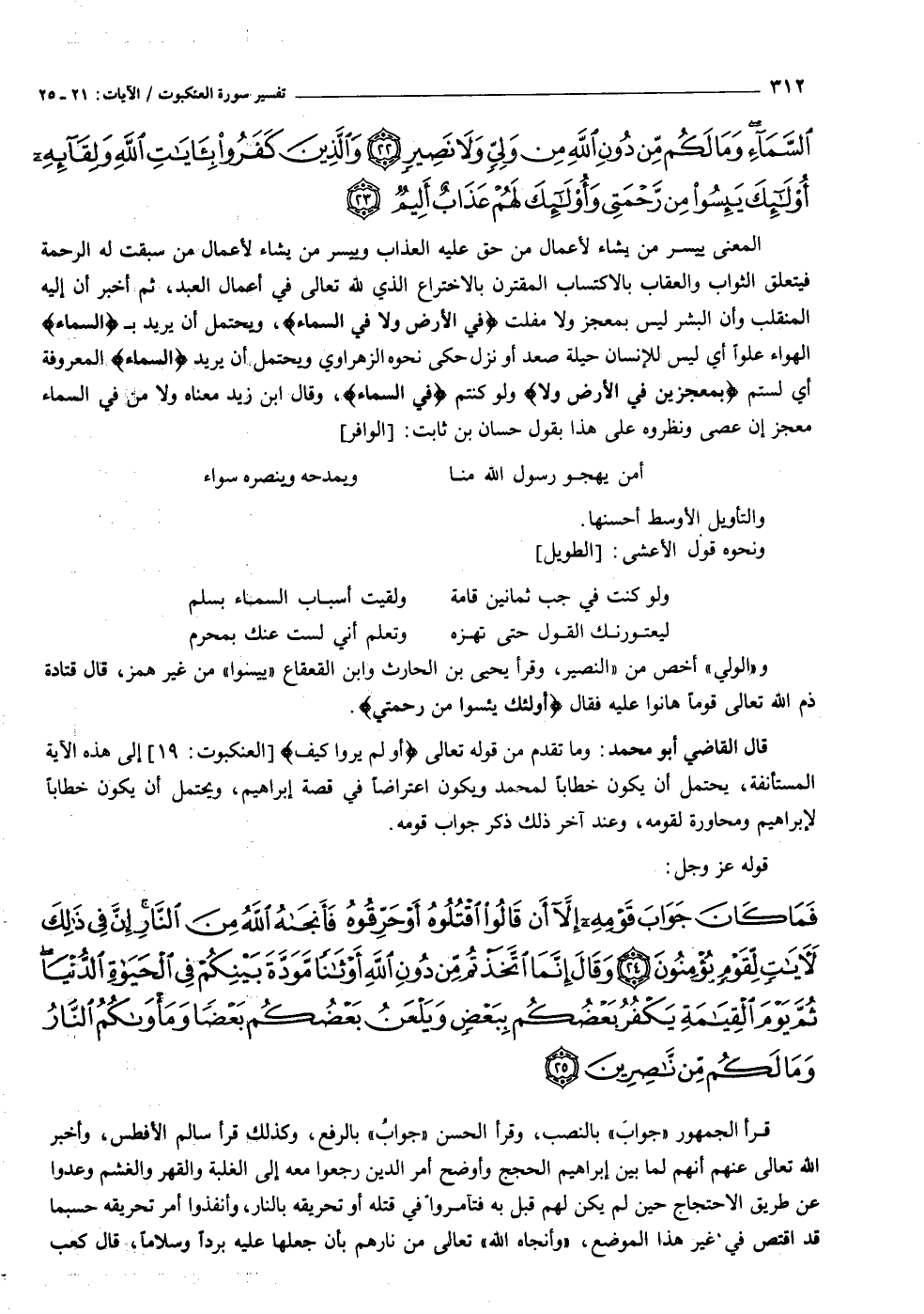 فَما كانَ جَوابَ قَوْمِهِ إِلاَّ أَنْ قالُوا اقْتُلُوهُ أَوْ حَرِّقُوهُ فَأَنْجاهُ اللَّهُ مِنَ النَّارِ إِنَّ فِي ذلِكَ لَآياتٍ لِقَوْمٍ يُؤْمِنُونَ (٢٤) وَقالَ إِنَّمَا اتَّخَذْتُمْ مِنْ دُونِ اللَّهِ أَوْثاناً مَوَدَّةَ بَيْنِكُمْ فِي الْحَياةِ الدُّنْيا ثُمَّ يَوْمَ الْقِيامَةِ يَكْفُرُ بَعْضُكُمْ بِبَعْضٍ وَيَلْعَنُ بَعْضُكُمْ بَعْضاً وَمَأْواكُمُ النَّارُ وَما لَكُمْ مِنْ ناصِرِينَ (٢٥)