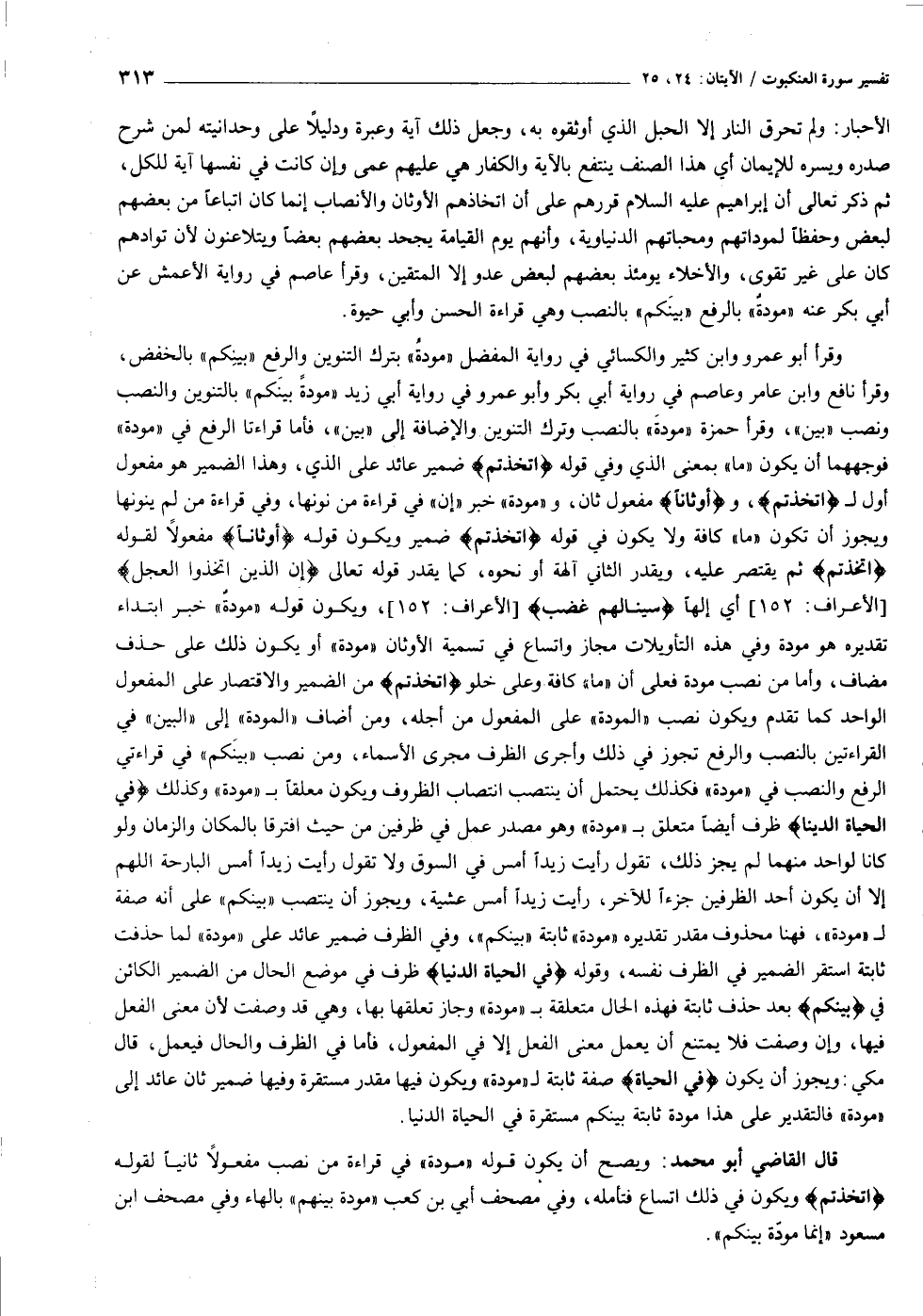 وقرأ أبو عمرو وابن كثير والكسائي في رواية المفضل «مودة» بترك التنوين والرفع «بينكم» بالخفض، وقرأ نافع وابن عامر وعاصم في رواية أبي بكر وأبو عمرو في رواية أبي زيد «مودة بينكم» بالتنوين والنصب ونصب «بين» ، وقرأ حمزة «مودة» بالنصب وترك التنوين والإضافة إلى «بين» ، فأما قراءتا الرفع في «مودة» فوجههما أن يكون «ما» بمعنى الذي وفي قوله اتَّخَذْتُمْ ضمير عائد على الذي، وهذا الضمير هو مفعول أول ل اتَّخَذْتُمْ، وأَوْثاناً مفعول ثان، و «مودة» خبر «إن» في قراءة من نونها، وفي قراءة من لم ينونها ويجوز أن تكون «ما» كافة ولا يكون في قوله اتَّخَذْتُمْ ضمير ويكون قوله أَوْثاناً مفعولا لقوله اتَّخَذْتُمْ ثم يقتصر عليه، ويقدر الثاني آلهة أو نحوه، كما يقدر قوله تعالى إِنَّ الَّذِينَ اتَّخَذُوا الْعِجْلَ [الأعراف: ١٥٢] أي إلها سَيَنالُهُمْ غَضَبٌ [الأعراف: ١٥٢] ، ويكون قوله «مودة» خبر ابتداء تقديره هو مودة وفي هذه التأويلات مجاز واتساع في تسمية الأوثان «مودة» أو يكون ذلك على حذف مضاف، وأما من نصب مودة فعلى أن «ما» كافة وعلى خلو اتَّخَذْتُمْ من الضمير والاقتصار على المفعول الواحد كما تقدم ويكون نصب «المودة» على المفعول من أجله، ومن أضاف «المودة» إلى «البين» في القراءتين بالنصب والرفع تجوز في ذلك وأجرى الظرف مجرى الأسماء، ومن نصب «بينكم» في قراءتي الرفع والنصب في «مودة» فكذلك يحتمل أن ينتصب انتصاب الظروف ويكون معلقا ب «مودة» وكذلك فِي الْحَياةِ الدُّنْيا ظرف أيضا متعلق ب «مودة» وهو مصدر عمل في ظرفين من حيث افترقا بالمكان والزمان ولو كانا لواحد منهما لم يجز ذلك، تقول رأيت زيدا أمس في السوق ولا تقول رأيت زيدا أمس البارحة اللهم إلا أن يكون أحد الظرفين جزءا للآخر، رأيت زيدا أمس عشية، ويجوز أن ينتصب «بينكم» على أنه صفة ل «مودة» ، فهنا محذوف مقدر تقديره «مودة» ثابتة «بينكم» ، وفي الظرف ضمير عائد على «مودة» لما حذفت ثابتة استقر الضمير في الظرف نفسه، وقوله فِي الْحَياةِ الدُّنْيا ظرف في موضع الحال من الضمير الكائن في بَيْنِكُمْ بعد حذف ثابتة فهذه الحال متعلقة ب «مودة» وجاز تعلقها بها، وهي قد وصفت لأن معنى الفعل فيها، وإن وصفت فلا يمتنع أن يعمل معنى الفعل إلا في المفعول، فأما في الظرف والحال فيعمل، قال مكي: ويجوز أن يكون فِي الْحَياةِ صفة ثابتة ل «مودة» ويكون فيها مقدر مستقرة وفيها ضمير ثان عائد إلى «مودة» فالتقدير على هذا مودة ثابتة بينكم مستقرة في الحياة الدنيا.