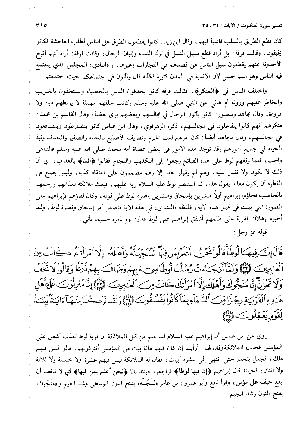 قالَ إِنَّ فِيها لُوطاً قالُوا نَحْنُ أَعْلَمُ بِمَنْ فِيها لَنُنَجِّيَنَّهُ وَأَهْلَهُ إِلاَّ امْرَأَتَهُ كانَتْ مِنَ الْغابِرِينَ (٣٢) وَلَمَّا أَنْ جاءَتْ رُسُلُنا لُوطاً سِيءَ بِهِمْ وَضاقَ بِهِمْ ذَرْعاً وَقالُوا لا تَخَفْ وَلا تَحْزَنْ إِنَّا مُنَجُّوكَ وَأَهْلَكَ إِلاَّ امْرَأَتَكَ كانَتْ مِنَ الْغابِرِينَ (٣٣) إِنَّا مُنْزِلُونَ عَلى أَهْلِ هذِهِ الْقَرْيَةِ رِجْزاً مِنَ السَّماءِ بِما كانُوا يَفْسُقُونَ (٣٤) وَلَقَدْ تَرَكْنا مِنْها آيَةً بَيِّنَةً لِقَوْمٍ يَعْقِلُونَ (٣٥)