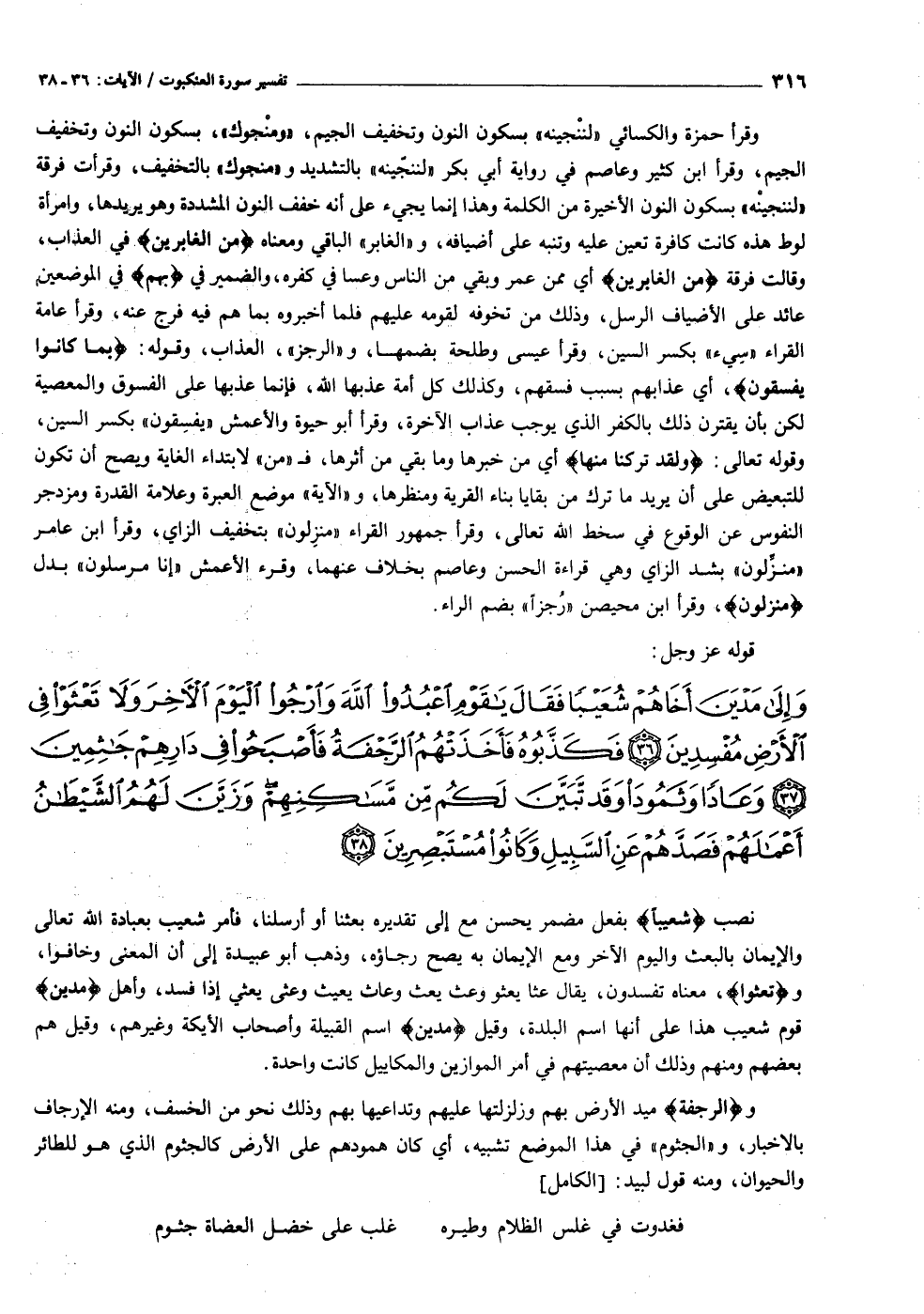 وَإِلى مَدْيَنَ أَخاهُمْ شُعَيْباً فَقالَ يا قَوْمِ اعْبُدُوا اللَّهَ وَارْجُوا الْيَوْمَ الْآخِرَ وَلا تَعْثَوْا فِي الْأَرْضِ مُفْسِدِينَ (٣٦) فَكَذَّبُوهُ فَأَخَذَتْهُمُ الرَّجْفَةُ فَأَصْبَحُوا فِي دارِهِمْ جاثِمِينَ (٣٧) وَعاداً وَثَمُودَ وَقَدْ تَبَيَّنَ لَكُمْ مِنْ مَساكِنِهِمْ وَزَيَّنَ لَهُمُ الشَّيْطانُ أَعْمالَهُمْ فَصَدَّهُمْ عَنِ السَّبِيلِ وَكانُوا مُسْتَبْصِرِينَ (٣٨)