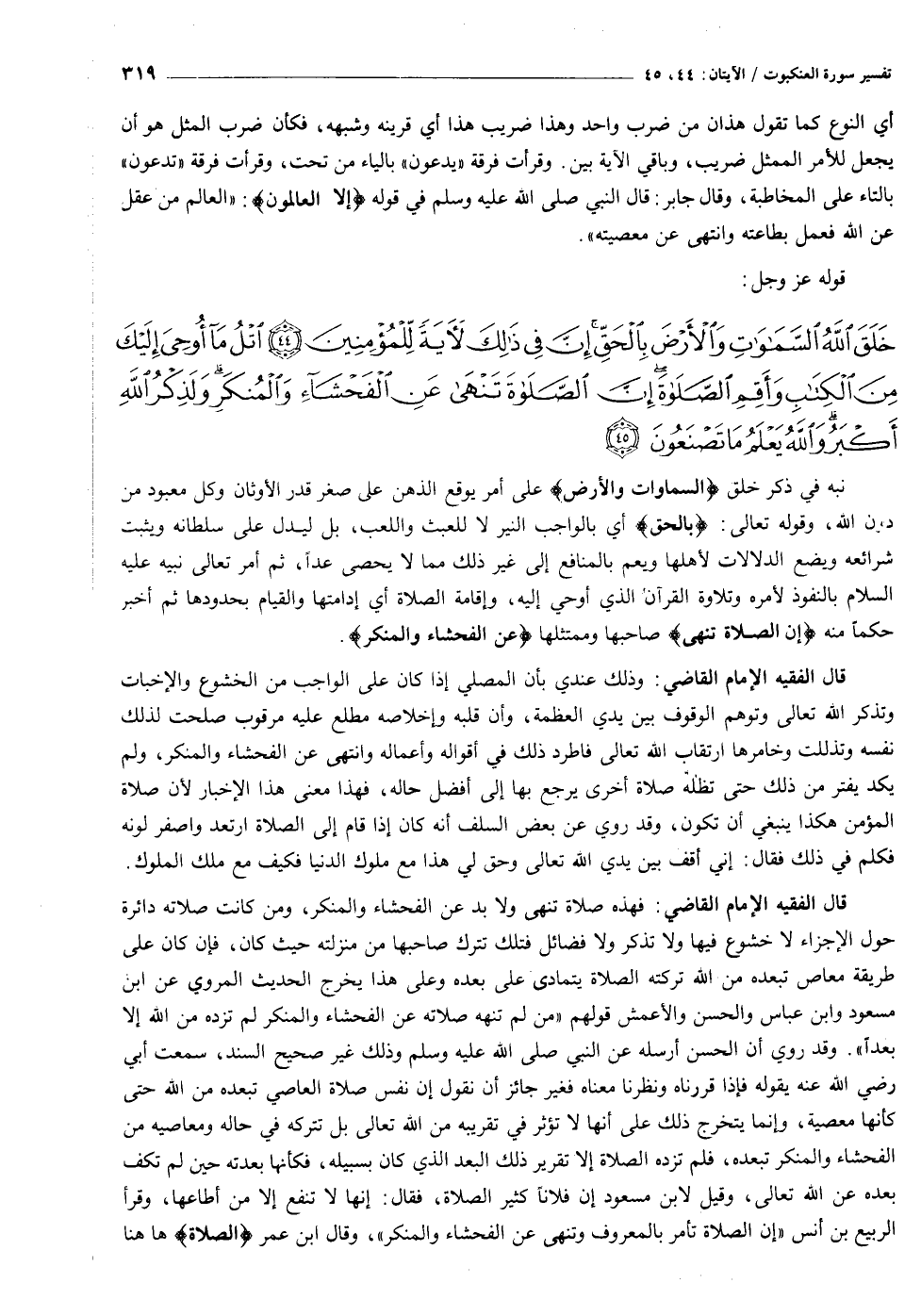 خَلَقَ اللَّهُ السَّماواتِ وَالْأَرْضَ بِالْحَقِّ إِنَّ فِي ذلِكَ لَآيَةً لِلْمُؤْمِنِينَ (٤٤) اتْلُ ما أُوحِيَ إِلَيْكَ مِنَ الْكِتابِ وَأَقِمِ الصَّلاةَ إِنَّ الصَّلاةَ تَنْهى عَنِ الْفَحْشاءِ وَالْمُنْكَرِ وَلَذِكْرُ اللَّهِ أَكْبَرُ وَاللَّهُ يَعْلَمُ ما تَصْنَعُونَ (٤٥)