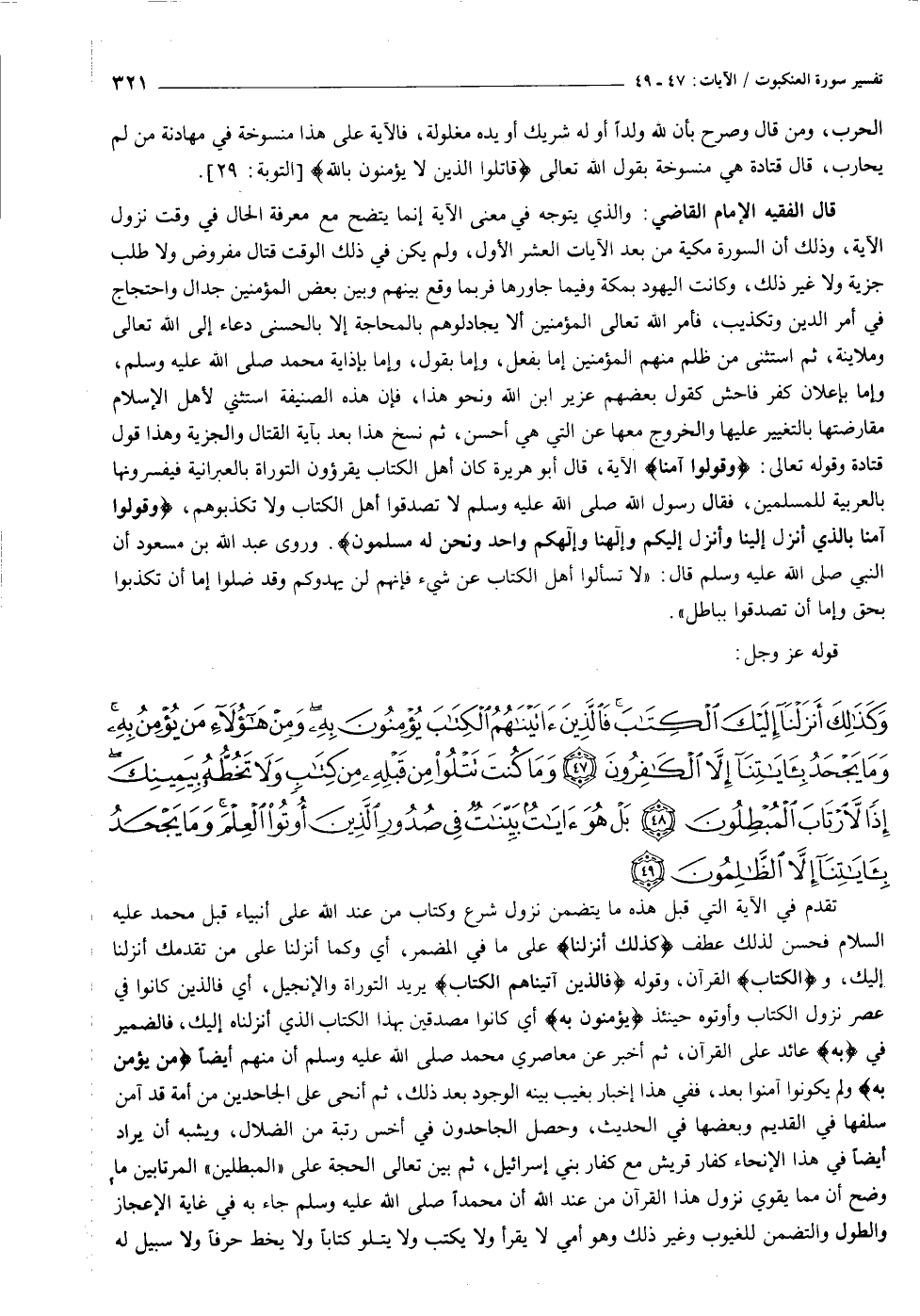 وَكَذلِكَ أَنْزَلْنا إِلَيْكَ الْكِتابَ فَالَّذِينَ آتَيْناهُمُ الْكِتابَ يُؤْمِنُونَ بِهِ وَمِنْ هؤُلاءِ مَنْ يُؤْمِنُ بِهِ وَما يَجْحَدُ بِآياتِنا إِلاَّ الْكافِرُونَ (٤٧) وَما كُنْتَ تَتْلُوا مِنْ قَبْلِهِ مِنْ كِتابٍ وَلا تَخُطُّهُ بِيَمِينِكَ إِذاً لارْتابَ الْمُبْطِلُونَ (٤٨) بَلْ هُوَ آياتٌ بَيِّناتٌ فِي صُدُورِ الَّذِينَ أُوتُوا الْعِلْمَ وَما يَجْحَدُ بِآياتِنا إِلاَّ الظَّالِمُونَ (٤٩)