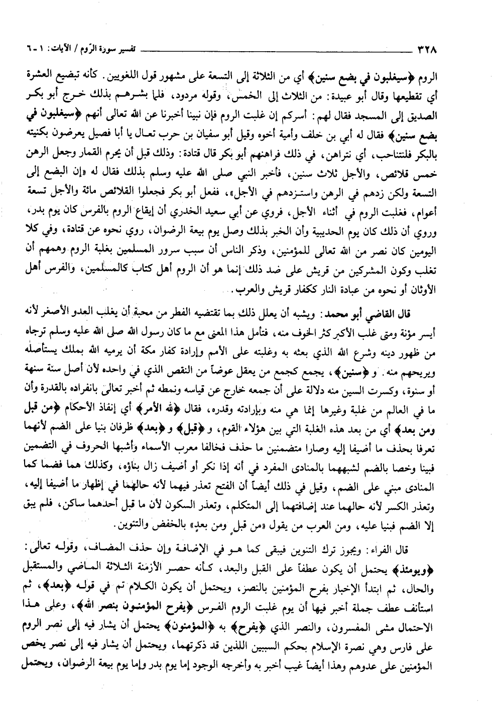 الروم سَيَغْلِبُونَ فِي بِضْعِ سِنِينَ أي من الثلاثة إلى التسعة على مشهور قول اللغويين. كأنه تبضيع العشرة أي تقطيعها وقال أبو عبيدة: من الثلاث إلى الخمس، وقوله مردود، فلما بشرهم بذلك خرج أبو بكر الصديق إلى المسجد فقال لهم: أسركم إن غلبت الروم فإن نبينا أخبرنا عن الله تعالى أنهم سَيَغْلِبُونَ فِي بِضْعِ سِنِينَ فقال له أبي بن خلف وأمية أخوه وقيل أبو سفيان بن حرب تعال يا أبا فصيل يعرضون بكنيته بالبكر فلنتناحب، أي نتراهن، في ذلك فراهنهم أبو بكر قال قتادة: وذلك قبل أن يحرم القمار وجعل الرهن خمس قلائص، والأجل ثلاث سنين، فأخبر النبي صلى الله عليه وسلم بذلك فقال له «إن البضع إلى التسعة ولكن زدهم في الرهن واستزدهم في الأجل» ، ففعل أبو بكر فجعلوا القلائص مائة والأجل تسعة أعوام، فغلبت الروم في أثناء الأجل، فروي عن أبي سعيد الخدري أن إيقاع الروم بالفرس كان يوم بدر، وروي أن ذلك كان يوم الحديبية وأن الخبر بذلك وصل يوم بيعة الرضوان، روي نحوه عن قتادة، وفي كلا اليومين كان نصر من الله تعالى للمؤمنين، وذكر الناس أن سبب سرور المسلمين بغلبة الروم وهمهم أن تغلب وكون المشركين من قريش على ضد ذلك إنما هو أن الروم أهل كتاب كالمسلمين، والفرس أهل الأوثان أو نحوه من عبادة النار ككفار قريش والعرب.