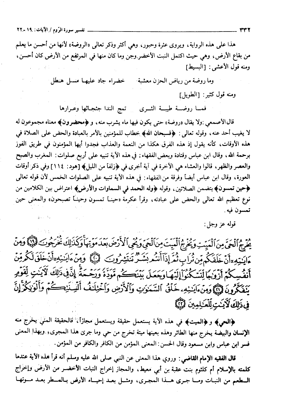 يُخْرِجُ الْحَيَّ مِنَ الْمَيِّتِ وَيُخْرِجُ الْمَيِّتَ مِنَ الْحَيِّ وَيُحْيِ الْأَرْضَ بَعْدَ مَوْتِها وَكَذلِكَ تُخْرَجُونَ (١٩) وَمِنْ آياتِهِ أَنْ خَلَقَكُمْ مِنْ تُرابٍ ثُمَّ إِذا أَنْتُمْ بَشَرٌ تَنْتَشِرُونَ (٢٠) وَمِنْ آياتِهِ أَنْ خَلَقَ لَكُمْ مِنْ أَنْفُسِكُمْ أَزْواجاً لِتَسْكُنُوا إِلَيْها وَجَعَلَ بَيْنَكُمْ مَوَدَّةً وَرَحْمَةً إِنَّ فِي ذلِكَ لَآياتٍ لِقَوْمٍ يَتَفَكَّرُونَ (٢١) وَمِنْ آياتِهِ خَلْقُ السَّماواتِ وَالْأَرْضِ وَاخْتِلافُ أَلْسِنَتِكُمْ وَأَلْوانِكُمْ إِنَّ فِي ذلِكَ لَآياتٍ لِلْعالِمِينَ (٢٢)