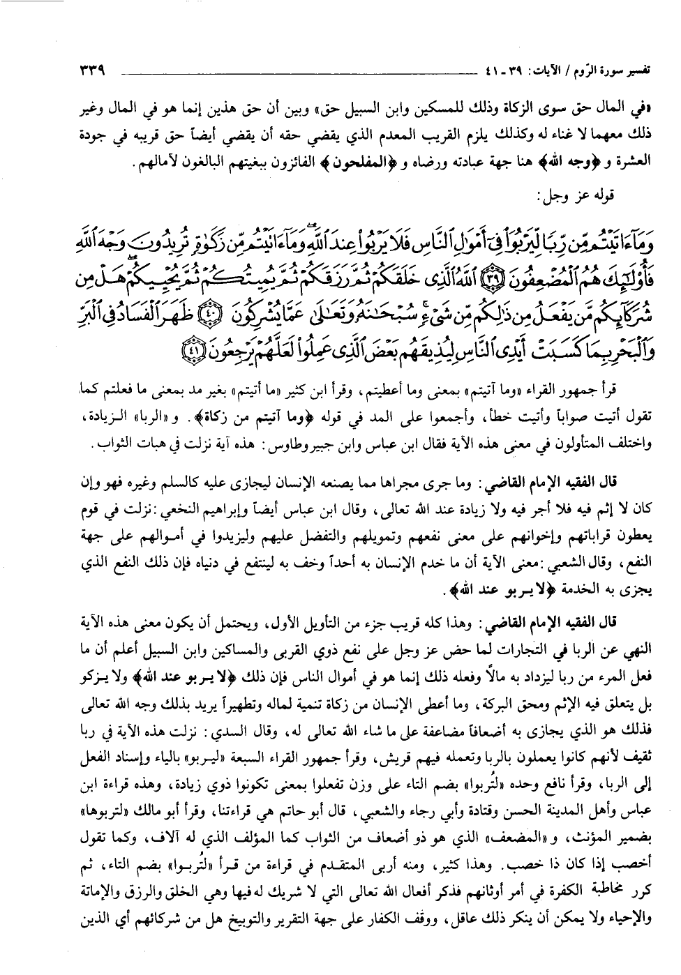 وَما آتَيْتُمْ مِنْ رِباً لِيَرْبُوَا فِي أَمْوالِ النَّاسِ فَلا يَرْبُوا عِنْدَ اللَّهِ وَما آتَيْتُمْ مِنْ زَكاةٍ تُرِيدُونَ وَجْهَ اللَّهِ فَأُولئِكَ هُمُ الْمُضْعِفُونَ (٣٩) اللَّهُ الَّذِي خَلَقَكُمْ ثُمَّ رَزَقَكُمْ ثُمَّ يُمِيتُكُمْ ثُمَّ يُحْيِيكُمْ هَلْ مِنْ شُرَكائِكُمْ مَنْ يَفْعَلُ مِنْ ذلِكُمْ مِنْ شَيْءٍ سُبْحانَهُ وَتَعالى عَمَّا يُشْرِكُونَ (٤٠) ظَهَرَ الْفَسادُ فِي الْبَرِّ وَالْبَحْرِ بِما كَسَبَتْ أَيْدِي النَّاسِ لِيُذِيقَهُمْ بَعْضَ الَّذِي عَمِلُوا لَعَلَّهُمْ يَرْجِعُونَ (٤١)