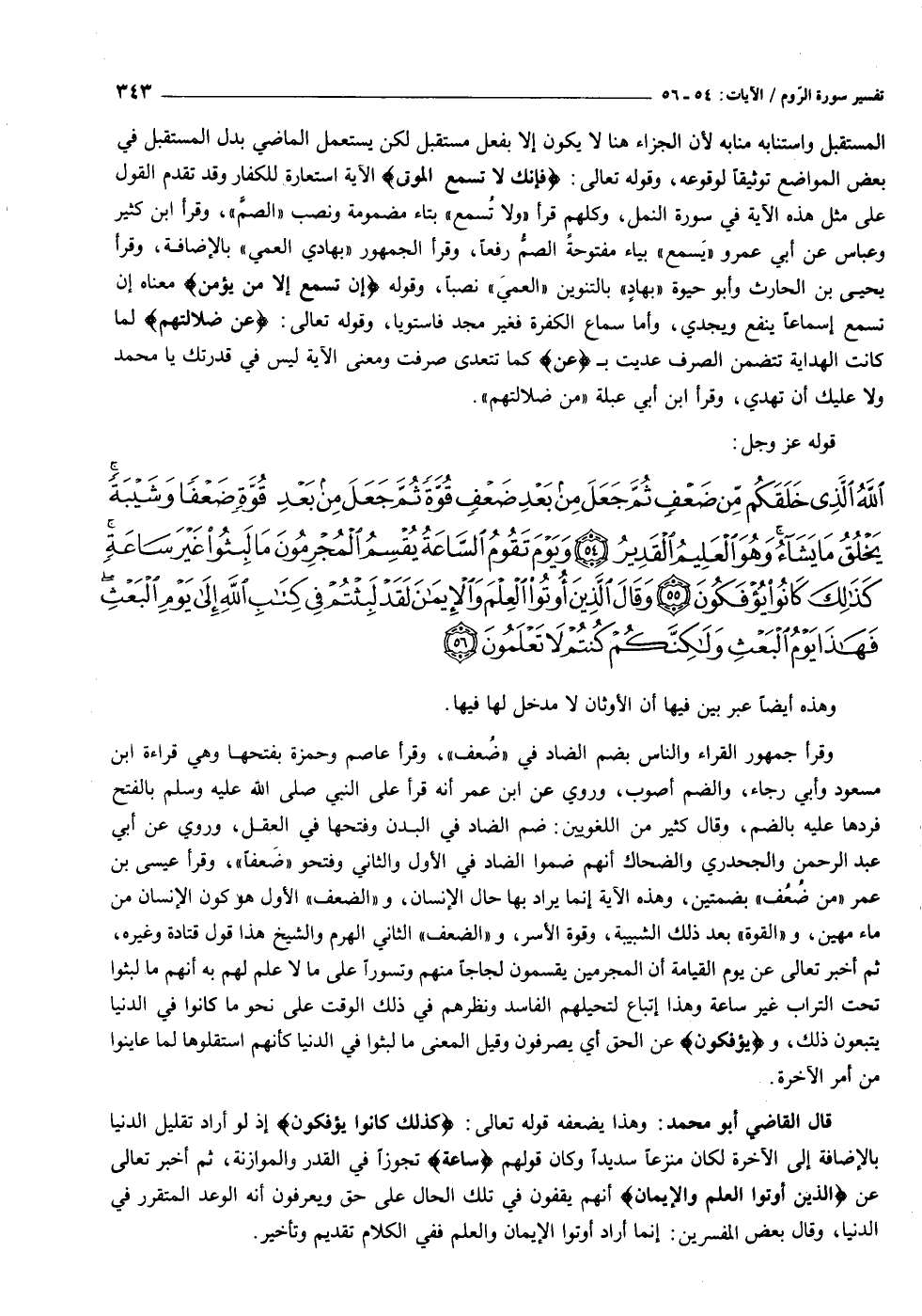 اللَّهُ الَّذِي خَلَقَكُمْ مِنْ ضَعْفٍ ثُمَّ جَعَلَ مِنْ بَعْدِ ضَعْفٍ قُوَّةً ثُمَّ جَعَلَ مِنْ بَعْدِ قُوَّةٍ ضَعْفاً وَشَيْبَةً يَخْلُقُ ما يَشاءُ وَهُوَ الْعَلِيمُ الْقَدِيرُ (٥٤) وَيَوْمَ تَقُومُ السَّاعَةُ يُقْسِمُ الْمُجْرِمُونَ ما لَبِثُوا غَيْرَ ساعَةٍ كَذلِكَ كانُوا يُؤْفَكُونَ (٥٥) وَقالَ الَّذِينَ أُوتُوا الْعِلْمَ وَالْإِيمانَ لَقَدْ لَبِثْتُمْ فِي كِتابِ اللَّهِ إِلى يَوْمِ الْبَعْثِ فَهذا يَوْمُ الْبَعْثِ وَلكِنَّكُمْ كُنْتُمْ لا تَعْلَمُونَ (٥٦)