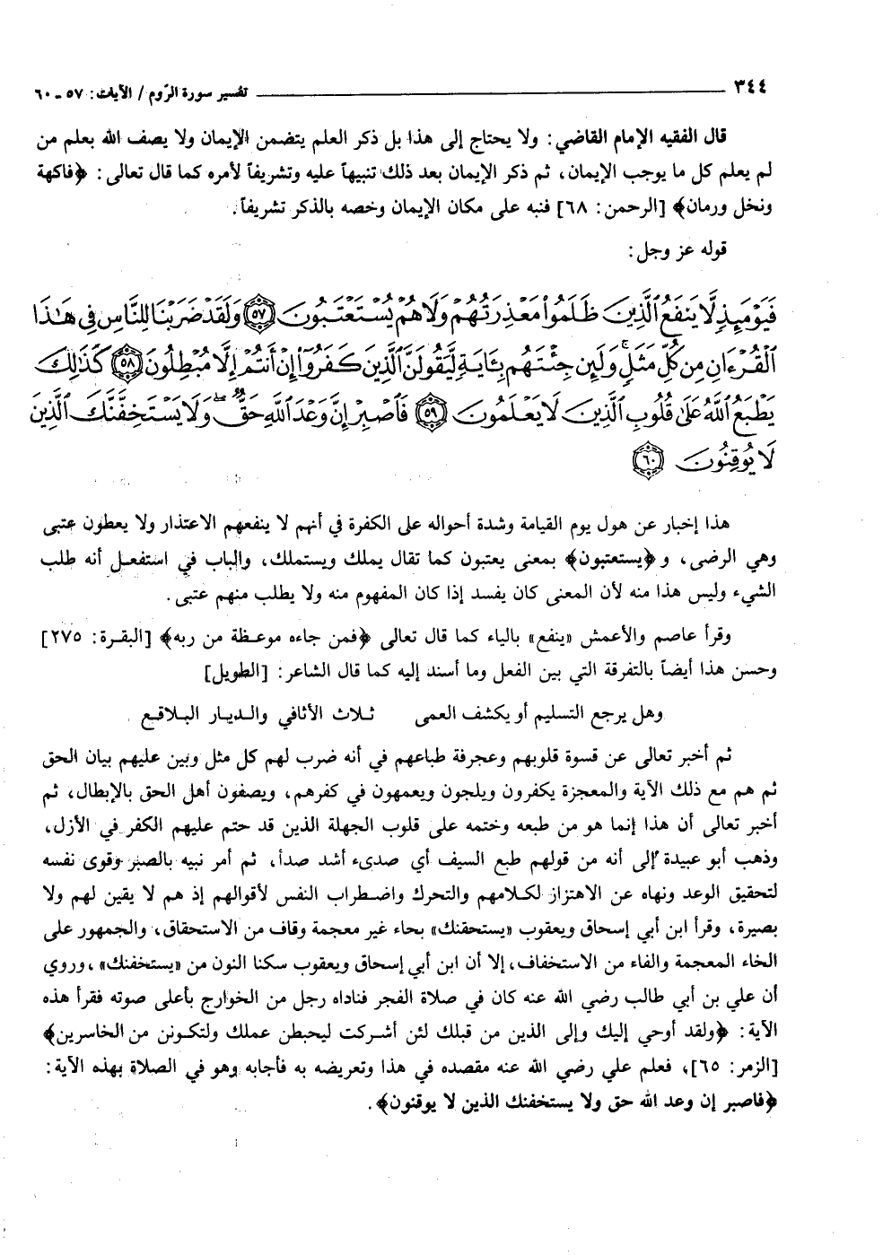 فَيَوْمَئِذٍ لا يَنْفَعُ الَّذِينَ ظَلَمُوا مَعْذِرَتُهُمْ وَلا هُمْ يُسْتَعْتَبُونَ (٥٧) وَلَقَدْ ضَرَبْنا لِلنَّاسِ فِي هذَا الْقُرْآنِ مِنْ كُلِّ مَثَلٍ وَلَئِنْ جِئْتَهُمْ بِآيَةٍ لَيَقُولَنَّ الَّذِينَ كَفَرُوا إِنْ أَنْتُمْ إِلاَّ مُبْطِلُونَ (٥٨) كَذلِكَ يَطْبَعُ اللَّهُ عَلى قُلُوبِ الَّذِينَ لا يَعْلَمُونَ (٥٩) فَاصْبِرْ إِنَّ وَعْدَ اللَّهِ حَقٌّ وَلا يَسْتَخِفَّنَّكَ الَّذِينَ لا يُوقِنُونَ (٦٠)