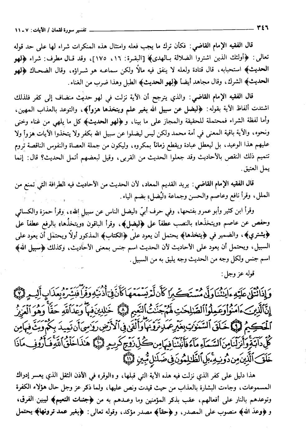 قال الفقيه الإمام القاضي: والذي يترجح أن الآية نزلت في لهو حديث منضاف إلى كفر فلذلك اشتدت ألفاظ الآية بقوله: لِيُضِلَّ عَنْ سَبِيلِ اللَّهِ بِغَيْرِ عِلْمٍ وَيَتَّخِذَها هُزُواً، والتوعد بالعذاب المهين، وأما لفظة الشراء فمحتملة للحقيقة والمجاز على ما بينا، ولَهْوَ الْحَدِيثِ كل ما يلهي من غناء وخنى ونحوه، والآية باقية المعنى في أمة محمد ولكن ليس ليضلوا عن سبيل الله بكفر ولا يتخذوا الآيات هزوا ولا عليهم هذا الوعيد، بل ليعطل عبادة ويقطع زمانا بمكروه، وليكون من جملة العصاة والنفوس الناقصة تروم تتميم ذلك النقص بالأحاديث وقد جعلوا الحديث من القربى، وقيل لبعضهم أتمل الحديث؟ قال: إنما يمل العتيق.