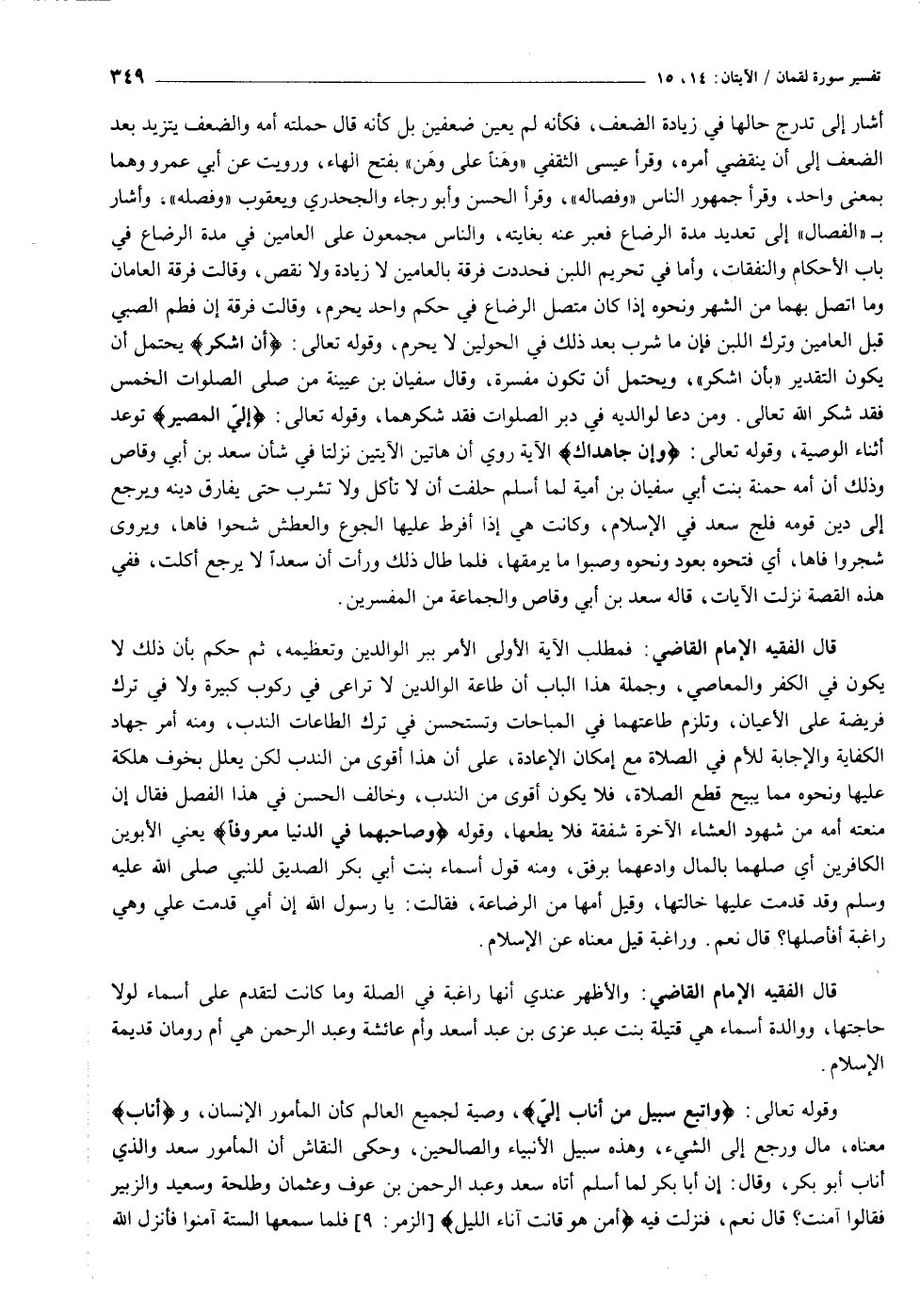 أشار إلى تدرج حالها في زيادة الضعف، فكأنه لم يعين ضعفين بل كأنه قال حملته أمه والضعف يتزيد بعد الضعف إلى أن ينقضي أمره، وقرأ عيسى الثقفي «وهنا على وهن» بفتح الهاء، ورويت عن أبي عمرو وهما بمعنى واحد، وقرأ جمهور الناس «وفصاله» ، وقرأ الحسن وأبو رجاء والجحدري ويعقوب «وفصله» ، وأشار ب «الفصال» إلى تعديد مدة الرضاع فعبر عنه بغايته، والناس مجمعون على العامين في مدة الرضاع في باب الأحكام والنفقات، وأما في تحريم اللبن فحددت فرقة بالعامين لا زيادة ولا نقص، وقالت فرقة العامان وما اتصل بهما من الشهر ونحوه إذا كان متصل الرضاع في حكم واحد يحرم، وقالت فرقة إن فطم الصبي قبل العامين وترك اللبن فإن ما شرب بعد ذلك في الحولين لا يحرم، وقوله تعالى: أَنِ اشْكُرْ يحتمل أن يكون التقدير «بأن اشكر» ، ويحتمل أن تكون مفسرة، وقال سفيان بن عيينة من صلى الصلوات الخمس فقد شكر الله تعالى. ومن دعا لوالديه في دبر الصلوات فقد شكرهما، وقوله تعالى: إِلَيَّ الْمَصِيرُ توعد أثناء الوصية، وقوله تعالى: وَإِنْ جاهَداكَ الآية روي أن هاتين الآيتين نزلتا في شأن سعد بن أبي وقاص وذلك أن أمه حمنة بنت أبي سفيان بن أمية لما أسلم حلفت أن لا تأكل ولا تشرب حتى يفارق دينه ويرجع إلى دين قومه فلج سعد في الإسلام، وكانت هي إذا أفرط عليها الجوع والعطش شحوا فاها، ويروى شجروا فاها، أي فتحوه بعود ونحوه وصبوا ما يرمقها، فلما طال ذلك ورأت أن سعدا لا يرجع أكلت، ففي هذه القصة نزلت الآيات، قاله سعد بن أبي وقاص والجماعة من المفسرين.