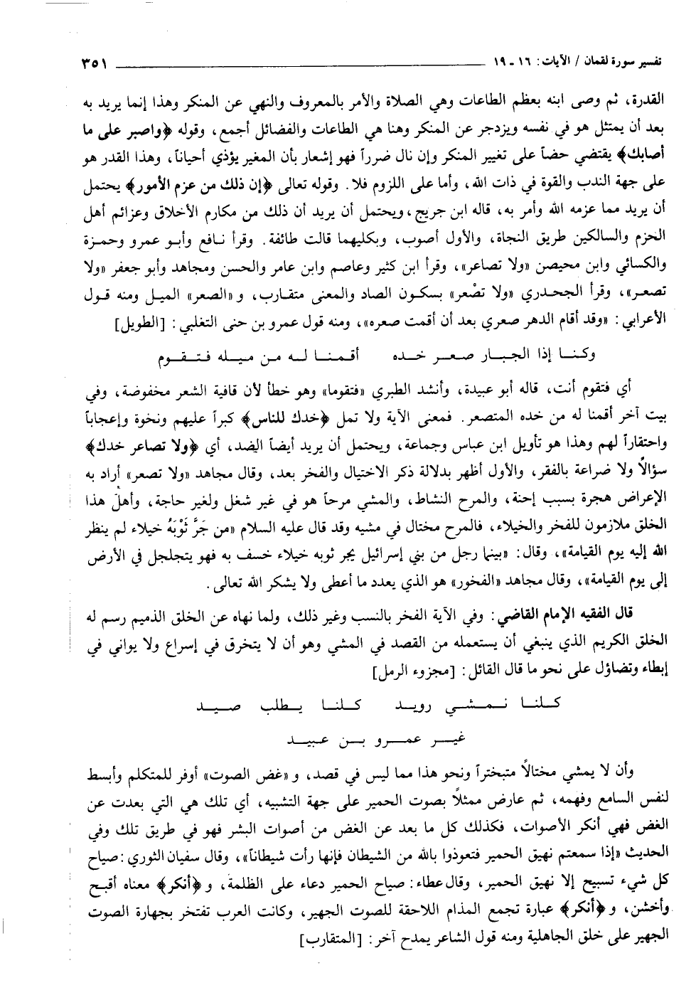 القدرة، ثم وصى ابنه بعظم الطاعات وهي الصلاة والأمر بالمعروف والنهي عن المنكر وهذا إنما يريد به بعد أن يمتثل هو في نفسه ويزدجر عن المنكر وهنا هي الطاعات والفضائل أجمع، وقوله وَاصْبِرْ عَلى ما أَصابَكَ يقتضي حضا على تغيير المنكر وإن نال ضررا فهو إشعار بأن المغير يؤذي أحيانا، وهذا القدر هو على جهة الندب والقوة في ذات الله، وأما على اللزوم فلا. وقوله تعالى إِنَّ ذلِكَ مِنْ عَزْمِ الْأُمُورِ يحتمل أن يريد مما عزمه الله وأمر به، قاله ابن جريج، ويحتمل أن يريد أن ذلك من مكارم الأخلاق وعزائم أهل الحزم والسالكين طريق النجاة، والأول أصوب، وبكليهما قالت طائفة. وقرأ نافع وأبو عمرو وحمزة والكسائي وابن محيصن «ولا تصاعر» ، وقرأ ابن كثير وعاصم وابن عامر والحسن ومجاهد وأبو جعفر «ولا تصعر» ، وقرأ الجحدري «ولا تصعر» بسكون الصاد والمعنى متقارب، و «الصعر» الميل ومنه قول الأعرابي: «وقد أقام الدهر صعري بعد أن أقمت صعره» ، ومنه قول عمرو بن حنى التغلبي: [الطويل]