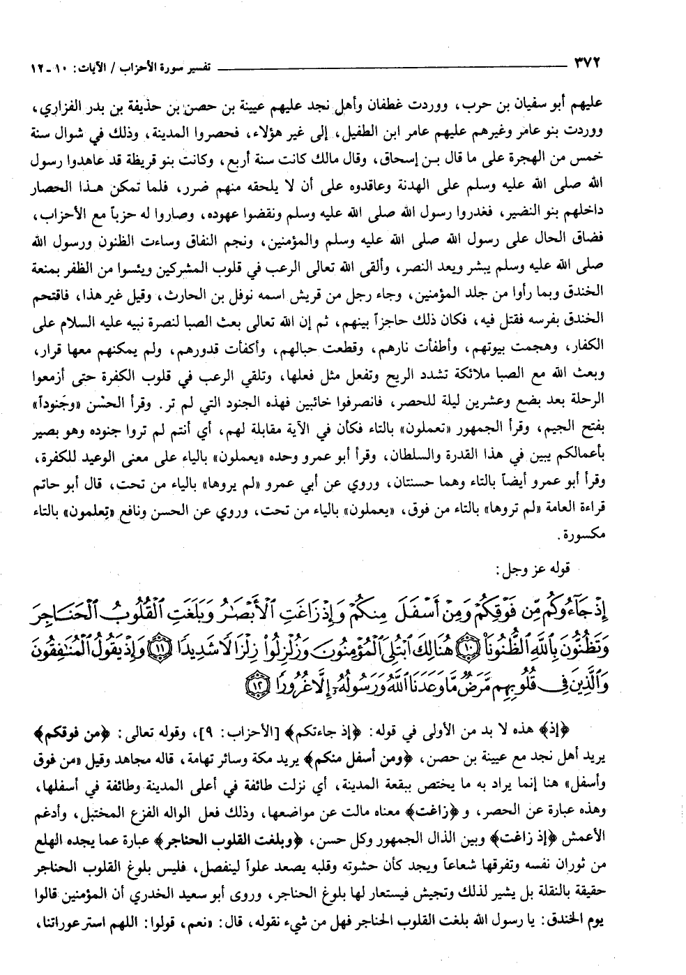 إِذْ جاؤُكُمْ مِنْ فَوْقِكُمْ وَمِنْ أَسْفَلَ مِنْكُمْ وَإِذْ زاغَتِ الْأَبْصارُ وَبَلَغَتِ الْقُلُوبُ الْحَناجِرَ وَتَظُنُّونَ بِاللَّهِ الظُّنُونَا (١٠) هُنالِكَ ابْتُلِيَ الْمُؤْمِنُونَ وَزُلْزِلُوا زِلْزالاً شَدِيداً (١١) وَإِذْ يَقُولُ الْمُنافِقُونَ وَالَّذِينَ فِي قُلُوبِهِمْ مَرَضٌ ما وَعَدَنَا اللَّهُ وَرَسُولُهُ إِلاَّ غُرُوراً (١٢)