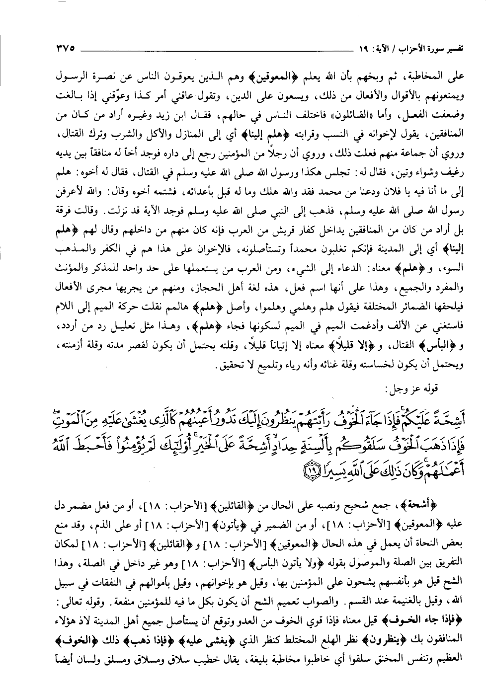 أَشِحَّةً عَلَيْكُمْ فَإِذا جاءَ الْخَوْفُ رَأَيْتَهُمْ يَنْظُرُونَ إِلَيْكَ تَدُورُ أَعْيُنُهُمْ كَالَّذِي يُغْشى عَلَيْهِ مِنَ الْمَوْتِ فَإِذا ذَهَبَ الْخَوْفُ سَلَقُوكُمْ بِأَلْسِنَةٍ حِدادٍ أَشِحَّةً عَلَى الْخَيْرِ أُولئِكَ لَمْ يُؤْمِنُوا فَأَحْبَطَ اللَّهُ أَعْمالَهُمْ وَكانَ ذلِكَ عَلَى اللَّهِ يَسِيراً (١٩)