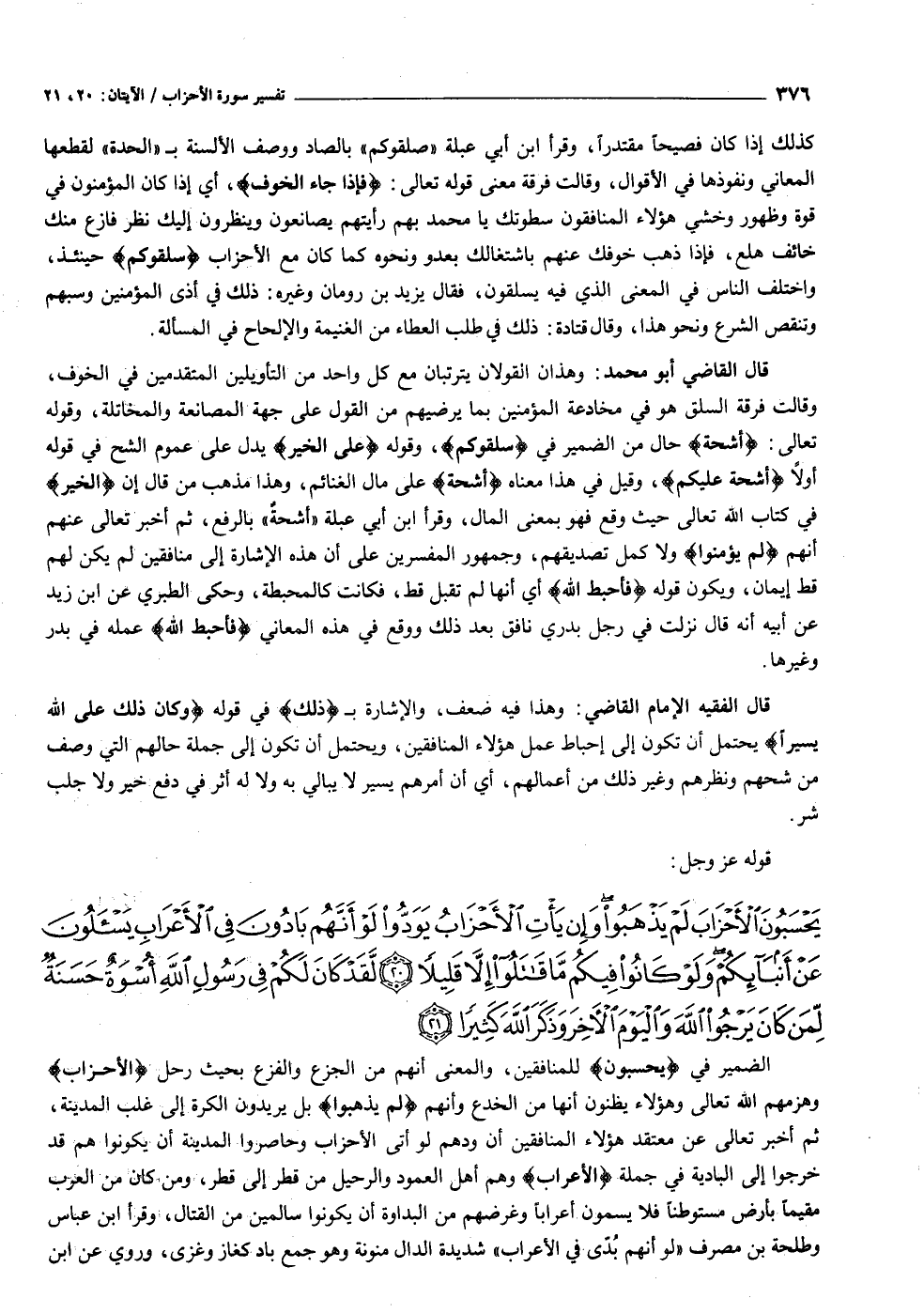 يَحْسَبُونَ الْأَحْزابَ لَمْ يَذْهَبُوا وَإِنْ يَأْتِ الْأَحْزابُ يَوَدُّوا لَوْ أَنَّهُمْ بادُونَ فِي الْأَعْرابِ يَسْئَلُونَ عَنْ أَنْبائِكُمْ وَلَوْ كانُوا فِيكُمْ ما قاتَلُوا إِلاَّ قَلِيلاً (٢٠) لَقَدْ كانَ لَكُمْ فِي رَسُولِ اللَّهِ أُسْوَةٌ حَسَنَةٌ لِمَنْ كانَ يَرْجُوا اللَّهَ وَالْيَوْمَ الْآخِرَ وَذَكَرَ اللَّهَ كَثِيراً (٢١)
