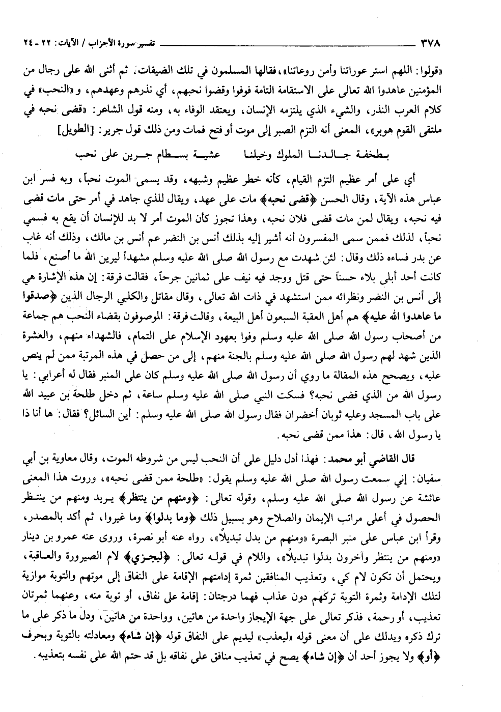 قال القاضي أبو محمد: فهذا أدل دليل على أن النحب ليس من شروطه الموت، وقال معاوية بن أبي سفيان: إني سمعت رسول الله صلى الله عليه وسلم يقول: «طلحة ممن قضى نحبه» ، وروت هذا المعنى عائشة عن رسول الله صلى الله عليه وسلم، وقوله تعالى: وَمِنْهُمْ مَنْ يَنْتَظِرُ يريد ومنهم من ينتظر الحصول في أعلى مراتب الإيمان والصلاح وهو بسبيل ذلك وَما بَدَّلُوا وما غيروا، ثم أكد بالمصدر، وقرأ ابن عباس على منبر البصرة «ومنهم من بدل تبديلا» ، رواه عنه أبو نصرة، وروى عنه عمرو بن دينار «ومنهم من ينتظر وآخرون بدلوا تبديلا» ، واللام في قوله تعالى: لِيَجْزِيَ لام الصيرورة والعاقبة، ويحتمل أن تكون لام كي، وتعذيب المنافقين ثمرة إدامتهم الإقامة على النفاق إلى موتهم والتوبة موازية لتلك الإدامة وثمرة التوبة تركهم دون عذاب فهما درجتان: إقامة على نفاق، أو توبة منه، وعنهما ثمرتان تعذيب، أو رحمة، فذكر تعالى على جهة الإيجاز واحدة من هاتين، وواحدة من هاتين، ودل ما ذكر على ما ترك ذكره ويدلك على أن معنى قوله «ليعذب» ليديم على النفاق قوله إِنْ شاءَ ومعادلته بالتوبة وبحرف أَوْ ولا يجوز أحد أن إِنْ شاءَ يصح في تعذيب منافق على نفاقه بل قد حتم الله على نفسه بتعذيبه.