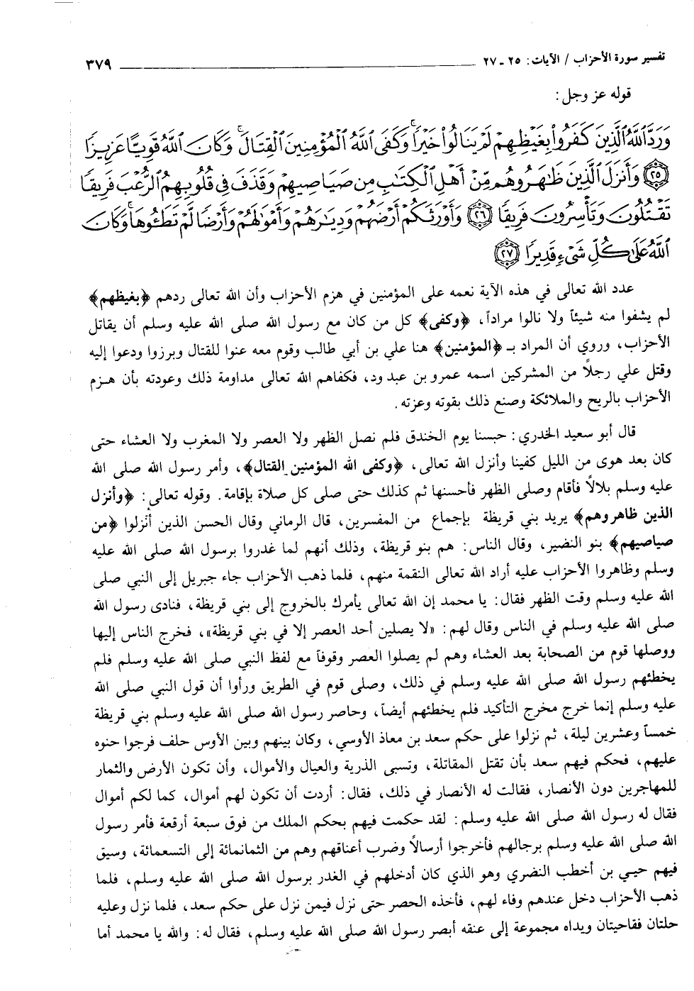 وَرَدَّ اللَّهُ الَّذِينَ كَفَرُوا بِغَيْظِهِمْ لَمْ يَنالُوا خَيْراً وَكَفَى اللَّهُ الْمُؤْمِنِينَ الْقِتالَ وَكانَ اللَّهُ قَوِيًّا عَزِيزاً (٢٥) وَأَنْزَلَ الَّذِينَ ظاهَرُوهُمْ مِنْ أَهْلِ الْكِتابِ مِنْ صَياصِيهِمْ وَقَذَفَ فِي قُلُوبِهِمُ الرُّعْبَ فَرِيقاً تَقْتُلُونَ وَتَأْسِرُونَ فَرِيقاً (٢٦) وَأَوْرَثَكُمْ أَرْضَهُمْ وَدِيارَهُمْ وَأَمْوالَهُمْ وَأَرْضاً لَمْ تَطَؤُها وَكانَ اللَّهُ عَلى كُلِّ شَيْءٍ قَدِيراً (٢٧)
