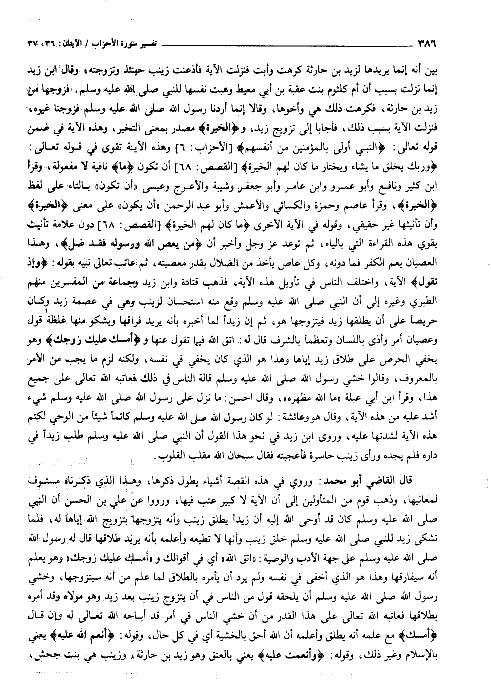قال القاضي أبو محمد: وروي في هذه القصة أشياء يطول ذكرها، وهذا الذي ذكرناه مستوف لمعانيها، وذهب قوم من المتأولين إلى أن الآية لا كبير عتب فيها، ورووا عن علي بن الحسن أن النبي صلى الله عليه وسلم كان قد أوحى الله إليه أن زيدا يطلق زينب وأنه يتزوجها بتزويج الله إياها له، فلما تشكى زيد للنبي صلى الله عليه وسلم خلق زينب وأنها لا تطيعه وأعلمه بأنه يريد طلاقها قال له رسول الله صلى الله عليه وسلم على جهة الأدب والوصية: «اتق الله» أي في أقوالك و «أمسك عليك زوجك» وهو يعلم أنه سيفارقها وهذا هو الذي أخفى في نفسه ولم يرد أن يأمره بالطلاق لما علم من أنه سيتزوجها، وخشي رسول الله صلى الله عليه وسلم أن يلحقه قول من الناس في أن يتزوج زينب بعد زيد وهو مولاه وقد أمره بطلاقها فعاتبه الله تعالى على هذا القدر من أن خشي الناس في أمر قد أباحه الله تعالى له وإن قال أَمْسِكْ مع علمه أنه يطلق وأعلمه أن الله أحق بالخشية أي في كل حال، وقوله: أَنْعَمَ اللَّهُ عَلَيْهِ يعني بالإسلام وغير ذلك، وقوله: وَأَنْعَمْتَ عَلَيْهِ يعني بالعتق وهو زيد بن حارثة، وزينب هي بنت جحش،
