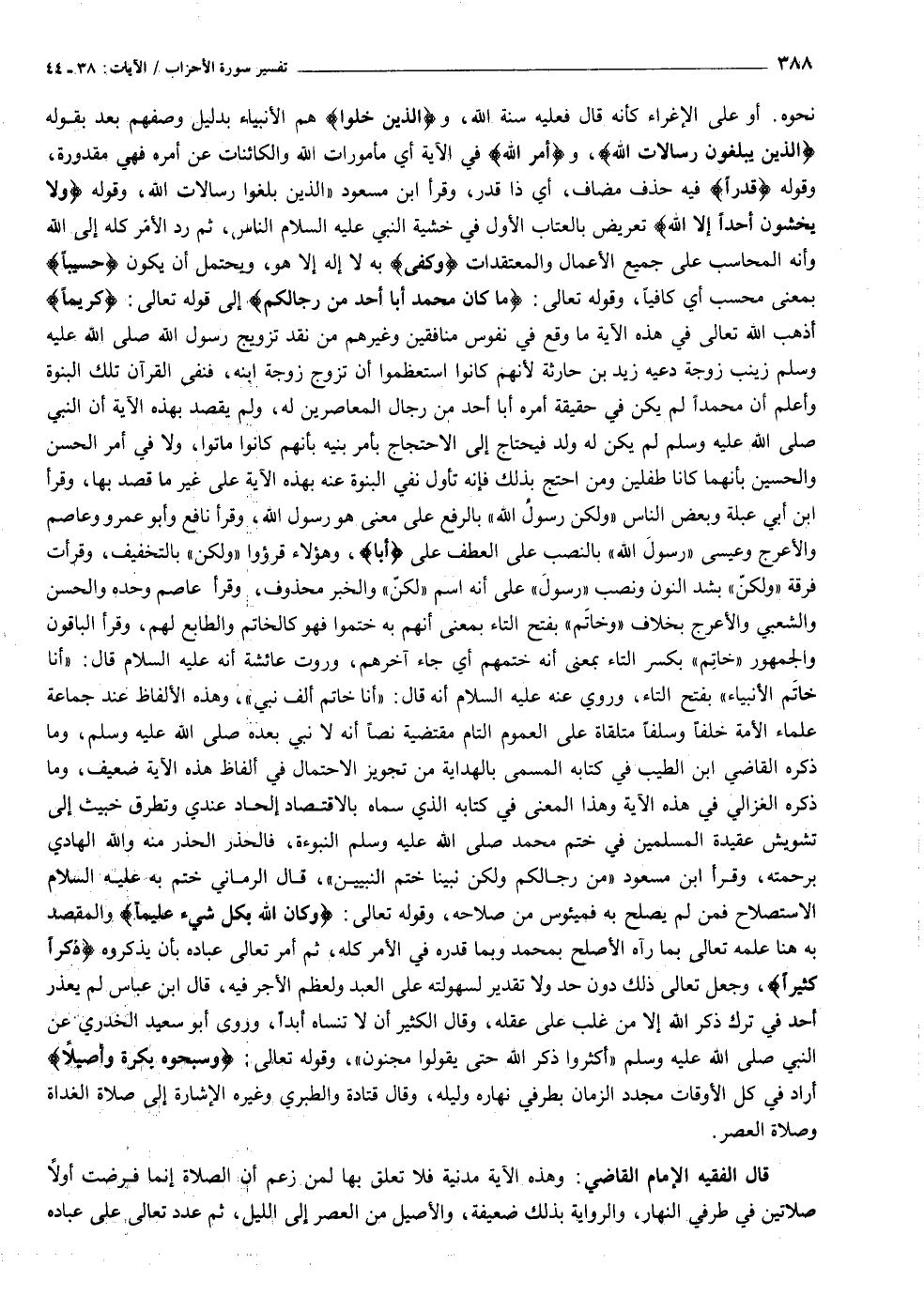 نحوه. أو على الإغراء كأنه قال فعليه سنة الله، والَّذِينَ خَلَوْا هم الأنبياء بدليل وصفهم بعد بقوله الَّذِينَ يُبَلِّغُونَ رِسالاتِ اللَّهِ، وأَمْرُ اللَّهِ في الآية أي مأمورات الله والكائنات عن أمره فهي مقدورة، وقوله قَدَراً فيه حذف مضاف، أي ذا قدر، وقرأ ابن مسعود «الذين بلغوا رسالات الله، وقوله وَلا يَخْشَوْنَ أَحَداً إِلَّا اللَّهَ تعريض بالعتاب الأول في خشية النبي عليه السلام الناس، ثم رد الأمر كله إلى الله وأنه المحاسب على جميع الأعمال والمعتقدات وَكَفى به لا إله إلا هو، ويحتمل أن يكون حَسِيباً بمعنى محسب أي كافيا، وقوله تعالى: ما كانَ مُحَمَّدٌ أَبا أَحَدٍ مِنْ رِجالِكُمْ إلى قوله تعالى: كَرِيماً أذهب الله تعالى في هذه الآية ما وقع في نفوس منافقين وغيرهم من نقد تزويج رسول الله صلى الله عليه وسلم زينب زوجة دعيه زيد بن حارثة لأنهم كانوا استعظموا أن تزوج زوجة ابنه، فنفى القرآن تلك البنوة وأعلم أن محمدا لم يكن في حقيقة أمره أبا أحد من رجال المعاصرين له، ولم يقصد بهذه الآية أن النبي صلى الله عليه وسلم لم يكن له ولد فيحتاج إلى الاحتجاج بأمر بنيه بأنهم كانوا ماتوا، ولا في أمر الحسن والحسين بأنهما كانا طفلين ومن احتج بذلك فإنه تأول نفي البنوة عنه بهذه الآية على غير ما قصد بها، وقرأ ابن أبي عبلة وبعض الناس «ولكن رسول الله» بالرفع على معنى هو رسول الله، وقرأ نافع وأبو عمرو وعاصم والأعرج وعيسى «رسول الله» بالنصب على العطف على أَبا، وهؤلاء قرؤوا «ولكن» بالتخفيف، وقرأت فرقة «ولكنّ» بشد النون ونصب «رسول» على أنه اسم «لكنّ» والخبر محذوف، وقرأ عاصم وحده والحسن والشعبي والأعرج بخلاف «وخاتم» بفتح التاء بمعنى أنهم به ختموا فهو كالخاتم والطابع لهم، وقرأ الباقون والجمهور «خاتم» بكسر التاء بمعنى أنه ختمهم أي جاء آخرهم، وروت عائشة أنه عليه السلام قال: «أنا خاتم الأنبياء» بفتح التاء، وروي عنه عليه السلام أنه قال: «أنا خاتم ألف نبي» ، وهذه الألفاظ عند جماعة علماء الأمة خلفا وسلفا متلقاة على العموم التام مقتضية نصا أنه لا نبي بعده صلى الله عليه وسلم، وما ذكره القاضي ابن الطيب في كتابه المسمى بالهداية من تجويز الاحتمال في ألفاظ هذه الآية ضعيف، وما ذكره الغزالي في هذه الآية وهذا المعنى في كتابه الذي سماه بالاقتصاد إلحاد عندي وتطرق خبيث إلى تشويش عقيدة المسلمين في ختم محمد صلى الله عليه وسلم النبوءة، فالحذر الحذر منه والله الهادي برحمته، وقرأ ابن مسعود «من رجالكم ولكن نبينا ختم النبيين» ، قال الرماني ختم به عليه السلام الاستصلاح فمن لم يصلح به فميئوس من صلاحه، وقوله تعالى: وَكانَ اللَّهُ بِكُلِّ شَيْءٍ عَلِيماً والمقصد به هنا علمه تعالى بما رآه الأصلح بمحمد وبما قدره في الأمر كله، ثم أمر تعالى عباده بأن يذكروه ذِكْراً كَثِيراً، وجعل تعالى ذلك دون حد ولا تقدير لسهولته على العبد ولعظم الأجر فيه، قال ابن عباس لم يعذر أحد في ترك ذكر الله إلا من غلب على عقله، وقال الكثير أن لا تنساه أبدا، وروى أبو سعيد الخدري عن النبي صلى الله عليه وسلم «أكثروا ذكر الله حتى يقولوا مجنون» ، وقوله تعالى: وَسَبِّحُوهُ بُكْرَةً وَأَصِيلًا أراد في كل الأوقات مجدد الزمان بطرفي نهاره وليله، وقال قتادة والطبري وغيره الإشارة إلى صلاة الغداة وصلاة العصر.