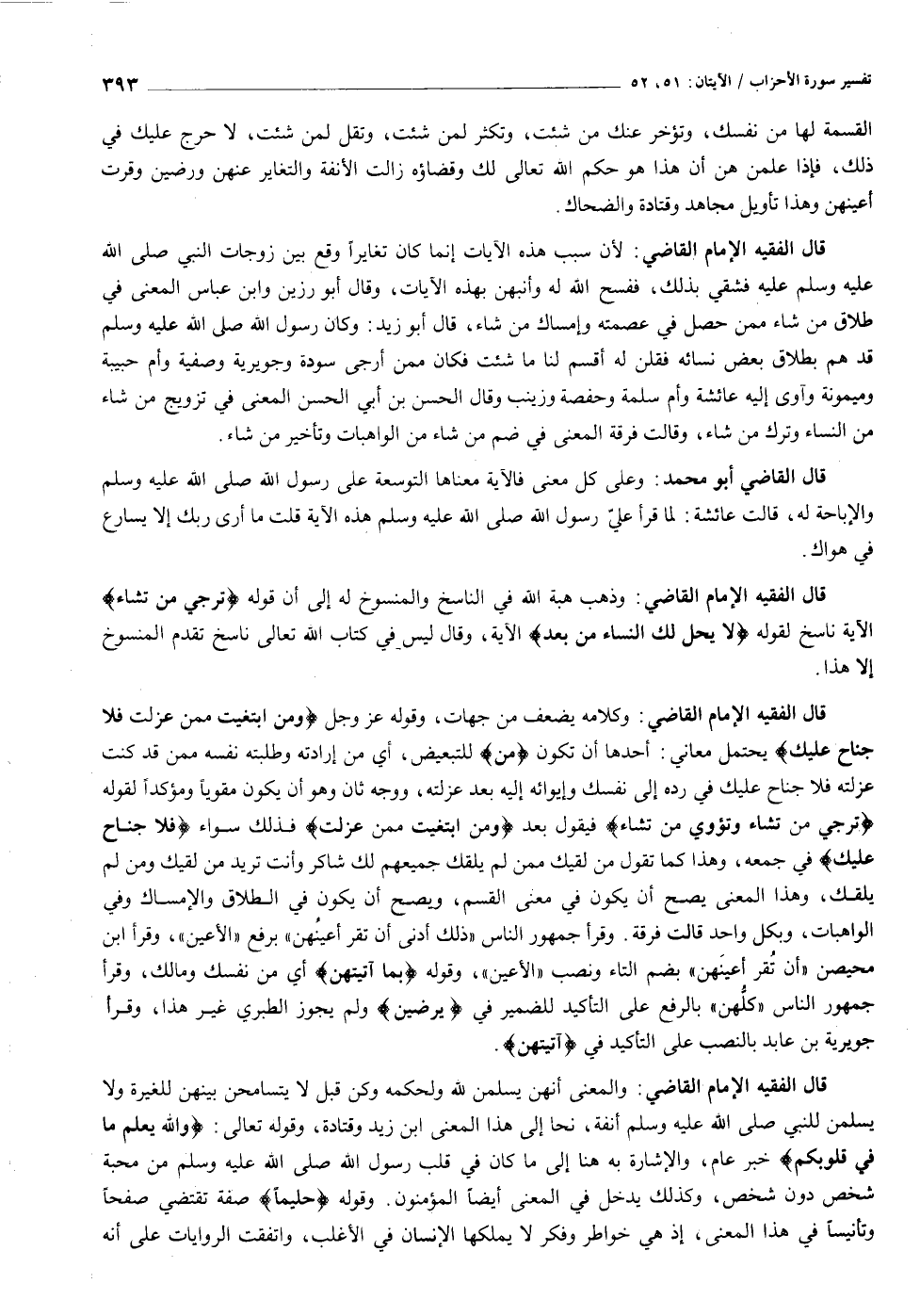 قال الفقيه الإمام القاضي: وكلامه يضعف من جهات، وقوله عز وجل وَمَنِ ابْتَغَيْتَ مِمَّنْ عَزَلْتَ فَلا جُناحَ عَلَيْكَ يحتمل معاني: أحدها أن تكون مَنْ للتبعيض، أي من إرادته وطلبته نفسه ممن قد كنت عزلته فلا جناح عليك في رده إلى نفسك وإيوائه إليه بعد عزلته، ووجه ثان وهو أن يكون مقويا ومؤكدا لقوله تُرْجِي مَنْ تَشاءُ وَتُؤْوِي مَنْ تَشاءُ فيقول بعد وَمَنِ ابْتَغَيْتَ مِمَّنْ عَزَلْتَ فذلك سواء فَلا جُناحَ عَلَيْكَ في جمعه، وهذا كما تقول من لقيك ممن لم يلقك جميعهم لك شاكر وأنت تريد من لقيك ومن لم يلقك، وهذا المعنى يصح أن يكون في معنى القسم، ويصح أن يكون في الطلاق والإمساك وفي الواهبات، وبكل واحد قالت فرقة. وقرأ جمهور الناس «ذلك أدنى أن تقر أعينهن» برفع «الأعين» ، وقرأ ابن محيصن «أن تقر أعينهن» بضم التاء ونصب «الأعين» ، وقوله بِما آتَيْتَهُنَّ أي من نفسك ومالك، وقرأ جمهور الناس «كلّهن» بالرفع على التأكيد للضمير في يَرْضَيْنَ ولم يجوز الطبري غير هذا، وقرأ جويرية بن عابد بالنصب على التأكيد في آتَيْتَهُنَّ.