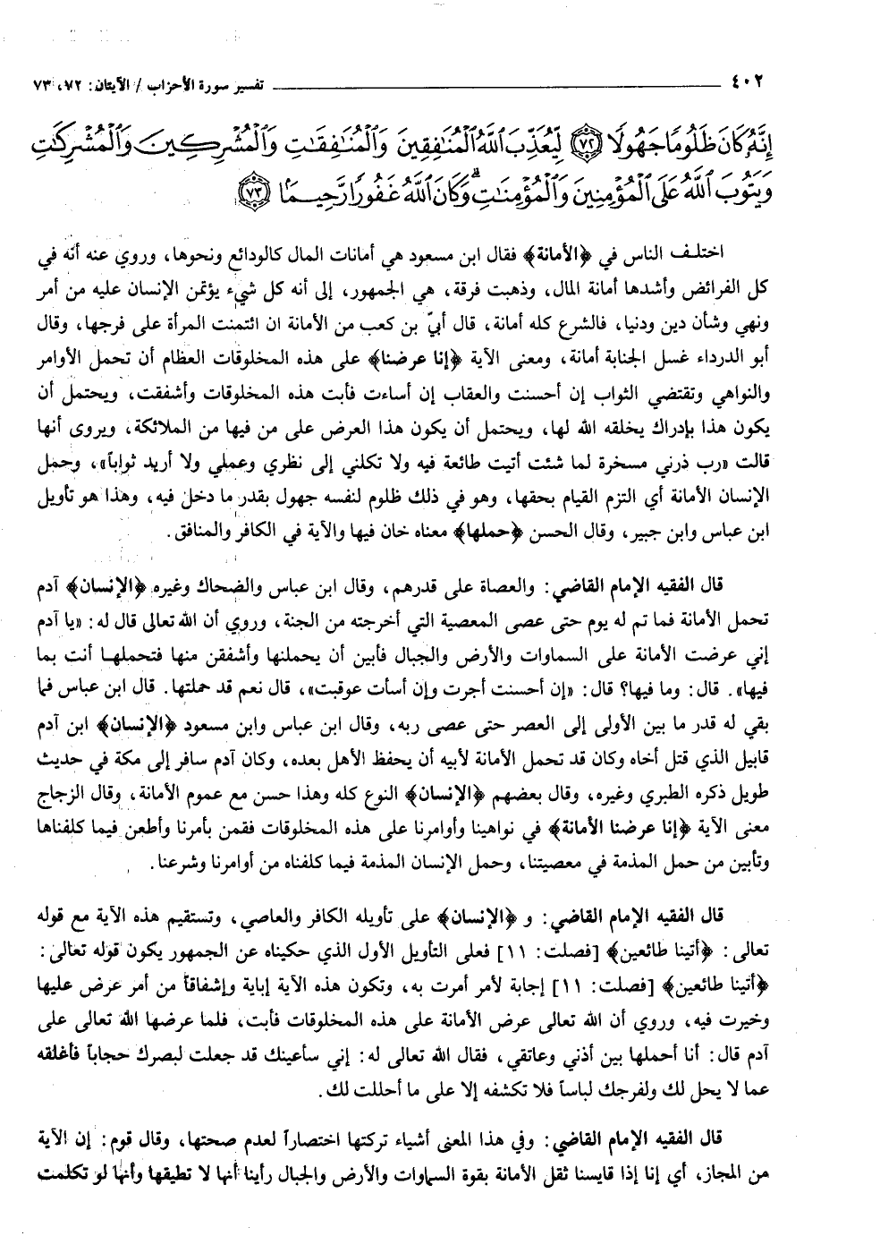 إِنَّا عَرَضْنَا الْأَمانَةَ عَلَى السَّماواتِ وَالْأَرْضِ وَالْجِبالِ فَأَبَيْنَ أَنْ يَحْمِلْنَها وَأَشْفَقْنَ مِنْها وَحَمَلَهَا الْإِنْسانُ إِنَّهُ كانَ ظَلُوماً جَهُولاً (٧٢) لِيُعَذِّبَ اللَّهُ الْمُنافِقِينَ وَالْمُنافِقاتِ وَالْمُشْرِكِينَ وَالْمُشْرِكاتِ وَيَتُوبَ اللَّهُ عَلَى الْمُؤْمِنِينَ وَالْمُؤْمِناتِ وَكانَ اللَّهُ غَفُوراً رَحِيماً (٧٣)