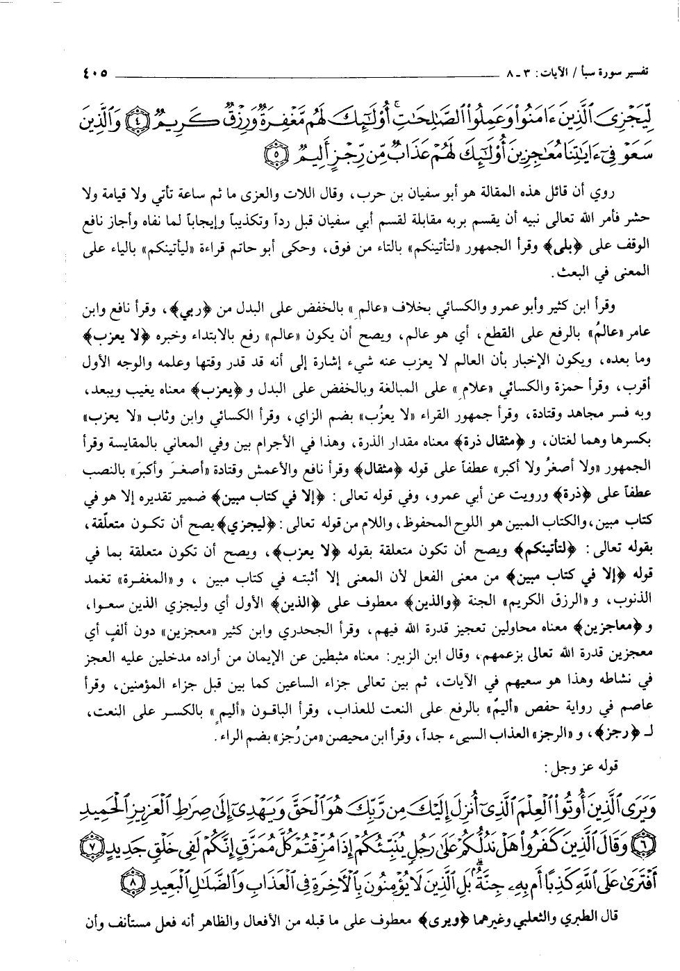 وقرأ ابن كثير وأبو عمرو والكسائي بخلاف «عالم» بالخفض على البدل من رَبِّي، وقرأ نافع وابن عامر «عالم» بالرفع على القطع، أي هو عالم، ويصح أن يكون «عالم» رفع بالابتداء وخبره لا يَعْزُبُ وما بعده، ويكون الإخبار بأن العالم لا يعزب عنه شيء إشارة إلى أنه قد قدر وقتها وعلمه والوجه الأول أقرب، وقرأ حمزة والكسائي «علام» على المبالغة وبالخفض على البدل ويَعْزُبُ معناه يغيب ويبعد، وبه فسر مجاهد وقتادة، وقرأ جمهور القراء «لا يعزب» بضم الزاي، وقرأ الكسائي وابن وثاب «لا يعزب» بكسرها وهما لغتان، ومِثْقالُ ذَرَّةٍ معناه مقدار الذرة، وهذا في الأجرام بين وفي المعاني بالمقايسة وقرأ الجمهور «ولا أصغر ولا أكبر» عطفا على قوله مِثْقالُ وقرأ نافع والأعمش وقتادة «أصغر وأكبر» بالنصب عطفا على ذَرَّةٍ ورويت عن أبي عمرو، وفي قوله تعالى: إِلَّا فِي كِتابٍ مُبِينٍ ضمير تقديره إلا هو في كتاب مبين، والكتاب المبين هو اللوح المحفوظ، واللام من قوله تعالى: لِيَجْزِيَ يصح أن تكون متعلّقة، بقوله تعالى: لَتَأْتِيَنَّكُمْ ويصح أن تكون متعلقة بقوله لا يَعْزُبُ، ويصح أن تكون متعلقة بما في قوله إِلَّا فِي كِتابٍ مُبِينٍ من معنى الفعل لأن المعنى إلا أثبته في كتاب مبين، و «المغفرة» تغمد الذنوب، و «الرزق الكريم» الجنة وَالَّذِينَ معطوف على الَّذِينَ الأول أي وليجزي الذين سعوا، ومُعاجِزِينَ معناه محاولين تعجيز قدرة الله فيهم، وقرأ الجحدري وابن كثير «معجزين» دون ألف أي معجزين قدرة الله تعالى بزعمهم، وقال ابن الزبير: معناه مثبطين عن الإيمان من أراده مدخلين عليه العجز في نشاطه وهذا هو سعيهم في الآيات، ثم بين تعالى جزاء الساعين كما بين قبل جزاء المؤمنين، وقرأ عاصم في رواية حفص «أليم» بالرفع على النعت للعذاب، وقرأ الباقون «أليم» بالكسر على النعت، ل رِجْزٍ، و «الرجز» العذاب السيّء جدا، وقرأ ابن محيصن «من رجز» بضم الراء.