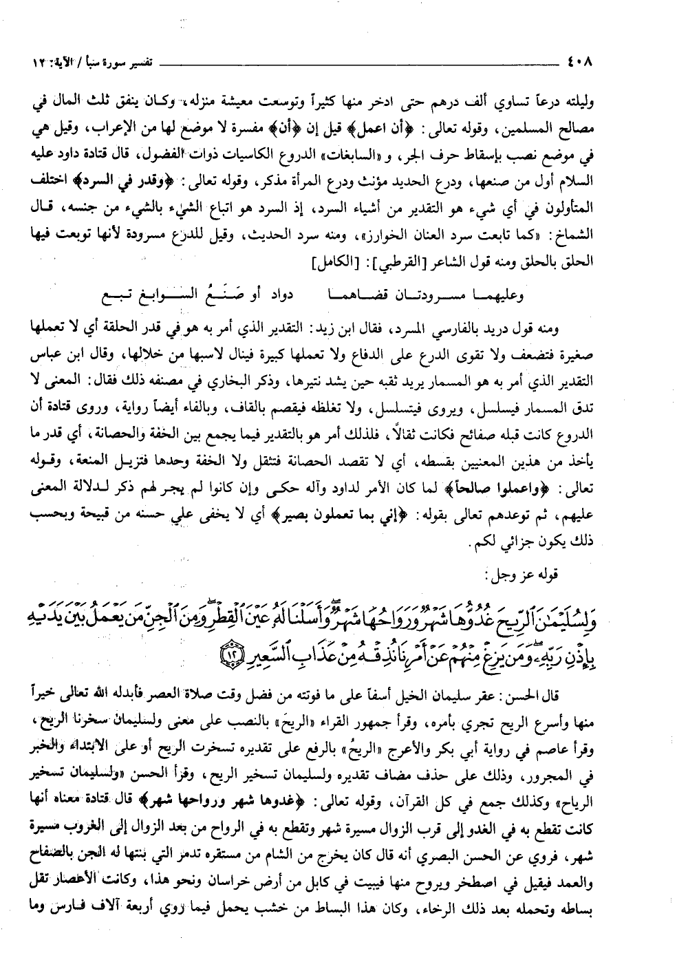 وليلته درعا تساوي ألف درهم حتى ادخر منها كثيرا وتوسعت معيشة منزله، وكان ينفق ثلث المال في مصالح المسلمين، وقوله تعالى: أَنِ اعْمَلْ قيل إن أَنِ مفسرة لا موضع لها من الإعراب، وقيل هي في موضع نصب بإسقاط حرف الجر، و «السابغات» الدروع الكاسيات ذوات الفضول، قال قتادة داود عليه السلام أول من صنعها، ودرع الحديد مؤنث ودرع المرأة مذكر، وقوله تعالى: وَقَدِّرْ فِي السَّرْدِ اختلف المتأولون في أي شيء هو التقدير من أشياء السرد، إذ السرد هو اتباع الشيء بالشيء من جنسه، قال الشماخ: «كما تابعت سرد العنان الخوارز» ، ومنه سرد الحديث، وقيل للدرع مسرودة لأنها توبعت فيها الحلق بالحلق ومنه قول الشاعر [القرطبي] : [الكامل]
