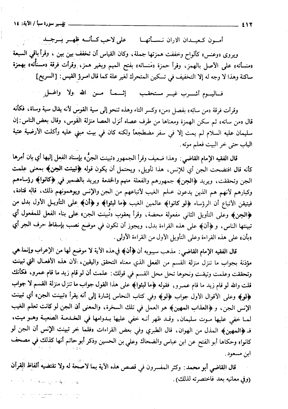 قال الفقيه الإمام القاضي: وهذا ضعيف وقرأ الجمهور «تبينت الجنّ» بإسناد الفعل إليها أي بان أمرها كأنه قال افتضحت الجن أي للإنس، هذا تأويل، ويحتمل أن يكون قوله تَبَيَّنَتِ الْجِنُّ بمعنى علمت الجن وتحققت، ويريد الْجِنُّ جمهورهم والفعلة منهم والخدمة ويريد بالضمير في كانُوا رؤساءهم وكبارهم لأنهم هم الذين يدعون علم الغيب لأتباعهم من الجن والإنس ويوهمونهم ذلك، قاله قتادة، فيتيقن الأتباع أن الرؤساء لَوْ كانُوا عالمين الغيب ما لَبِثُوا وأَنْ على التأويل الأول بدل من الْجِنُّ وعلى التأويل الثاني مفعولة محضة، وقرأ يعقوب «تبينت الجن» على بناء الفعل للمفعول أي تبينتها الناس، وأَنْ على هذه القراءة بدل، ويجوز أن تكون في موضع نصب بإسقاط حرف الجر أي «بأن» على هذه القراءة وعلى التأويل الأول من القراءة الأولى.