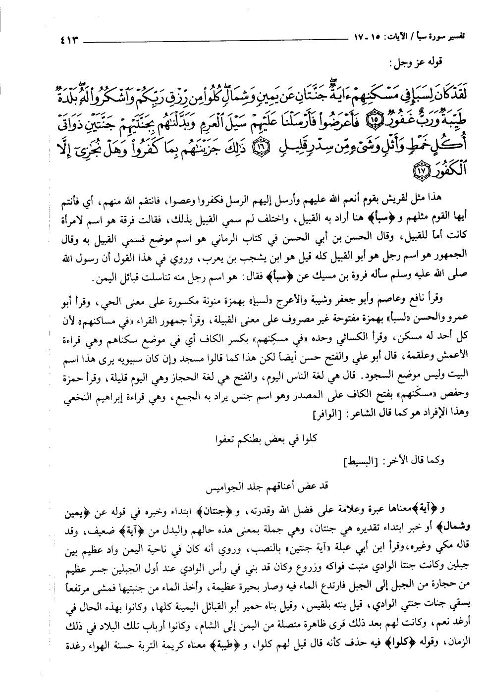لَقَدْ كانَ لِسَبَإٍ فِي مَسْكَنِهِمْ آيَةٌ جَنَّتانِ عَنْ يَمِينٍ وَشِمالٍ كُلُوا مِنْ رِزْقِ رَبِّكُمْ وَاشْكُرُوا لَهُ بَلْدَةٌ طَيِّبَةٌ وَرَبٌّ غَفُورٌ (١٥) فَأَعْرَضُوا فَأَرْسَلْنا عَلَيْهِمْ سَيْلَ الْعَرِمِ وَبَدَّلْناهُمْ بِجَنَّتَيْهِمْ جَنَّتَيْنِ ذَواتَيْ أُكُلٍ خَمْطٍ وَأَثْلٍ وَشَيْءٍ مِنْ سِدْرٍ قَلِيلٍ (١٦) ذلِكَ جَزَيْناهُمْ بِما كَفَرُوا وَهَلْ نُجازِي إِلاَّ الْكَفُورَ (١٧)