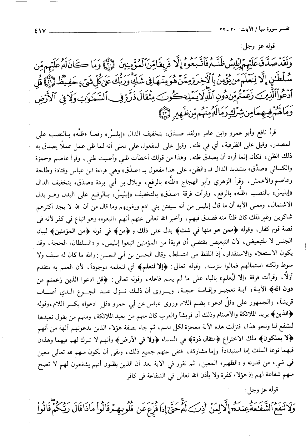 قرأ نافع وأبو عمرو وابن عامر «ولقد صدق» بتخفيف الدال «إبليس» رفعا «ظنّه» بالنصب على المصدر، وقيل على الظرفية، أي في ظنه، وقيل على المفعول على معنى أنه لما ظن عمل عملا يصدق به ذلك الظن، فكأنه إنما أراد أن يصدق ظنه، وهذا من قولك أخطأت ظني وأصبت ظني، وقرأ عاصم وحمزة والكسائي «صدّق» بتشديد الدال ف «الظن» على هذا مفعول ب «صدّق» وهي قراءة ابن عباس وقتادة وطلحة وعاصم والأعمش، وقرأ الزهري وأبو الهجاج «ظنّه» بالرفع، وبلال بن أبي بردة «صدق» بتخفيف الدال «إبليس» بالنصب «ظنّه» بالرفع، وقرأت فرقة «صدق» بالتخفيف «إبليس» بالرفع على البدل وهو بدل الاشتمال، ومعنى الآية أن ما قال إبليس من أنه سيفتن بني آدم ويغويهم وما قال من أن الله لا يجد أكثرهم شاكرين وغير ذلك كان ظنا منه فصدق فيهم، وأخبر الله تعالى عنهم أنهم «اتبعوه» وهو اتباع في كفر لأنه في قصة قوم كفار، وقوله مِمَّنْ هُوَ مِنْها فِي شَكٍّ يدل على ذلك ومِنَ في قوله مِنَ الْمُؤْمِنِينَ لبيان الجنس لا للتبعيض، لأن التبعيض يقتضي أن فريقا من المؤمنين اتبعوا إبليس، و «السلطان» الحجة، وقد يكون الاستعلاء والاستقدار، إذ اللفظ من التسلط، وقال الحسن بن أبي الحسن: والله ما كان له سيف ولا سوط ولكنه استمالهم فمالوا بتزيينه، وقوله تعالى: إِلَّا لِنَعْلَمَ أي لنعلمه موجودا، لأن العلم به متقدم أزلا، وقرأت فرقة «إلا ليعلم» بالياء على ما لم يسم فاعله، وقوله تعالى: قُلِ ادْعُوا الَّذِينَ زَعَمْتُمْ مِنْ دُونِ اللَّهِ الآية، آية تعجيز وإقامة حجة، ويروى أن ذلك نزل عند الجوع الذي أصاب قريشا، والجمهور على «قل ادعوا» بضم اللام وروى عباس عن أبي عمرو «قل ادعوا» بكسر اللام، وقوله الَّذِينَ يريد الملائكة والأصنام وذلك أن قريشا والعرب كان منهم من يعبد الملائكة، ومنهم من يقول نعبدها لتشفع لنا ونحو هذا، فنزلت هذه الآية معجزة لكل منهم، ثم جاء بصفة هؤلاء الذين يدعونهم آلهة من أنهم لا يَمْلِكُونَ ملك الاختراع مِثْقالَ ذَرَّةٍ في السماء وَلا فِي الْأَرْضِ وأنهم لا شرك لهم فيهما وهذان فيهما نوعا الملك إما استبدادا وإما مشاركة، فنفى عنهم جميع ذلك، ونفى أن يكون منهم لله تعالى معين في شيء من قدرته و «الظهير» المعين، ثم تقرر في الآية بعد أن الذين يظنون أنهم يشفعون لهم لا تصح منهم شفاعة لهم إذ هؤلاء كفرة ولا يأذن الله تعالى في الشفاعة في كافر.